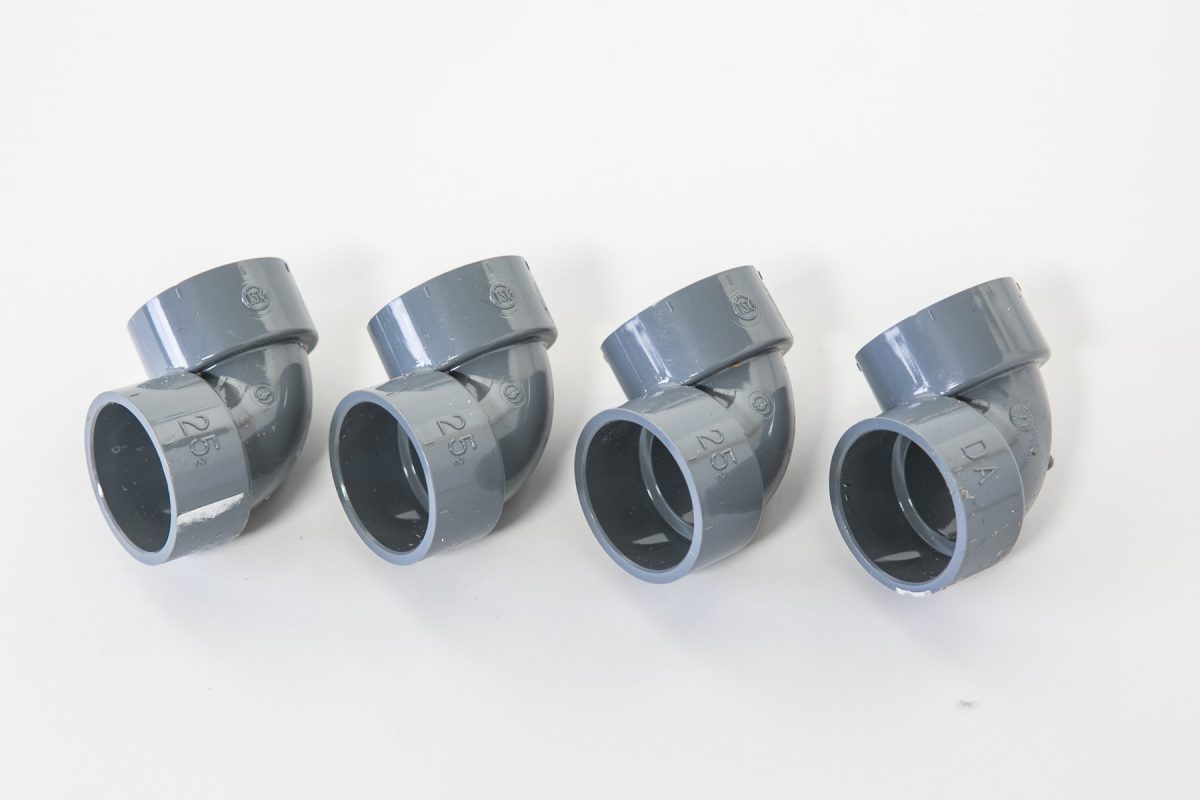 一番上にくる横のパイプと縦の3.5㎝のパイプを接続するためのL 字型のDVエルボ。4個用意。1個約80円