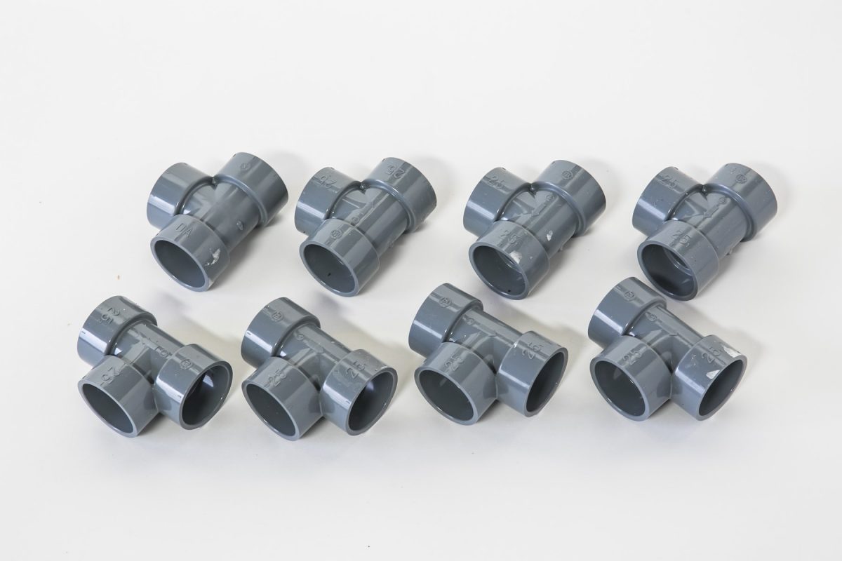 3口の継手になっているDVチーズは、縦と横のパイプを接続するためのパーツ。全部で8個用意。1個150円。