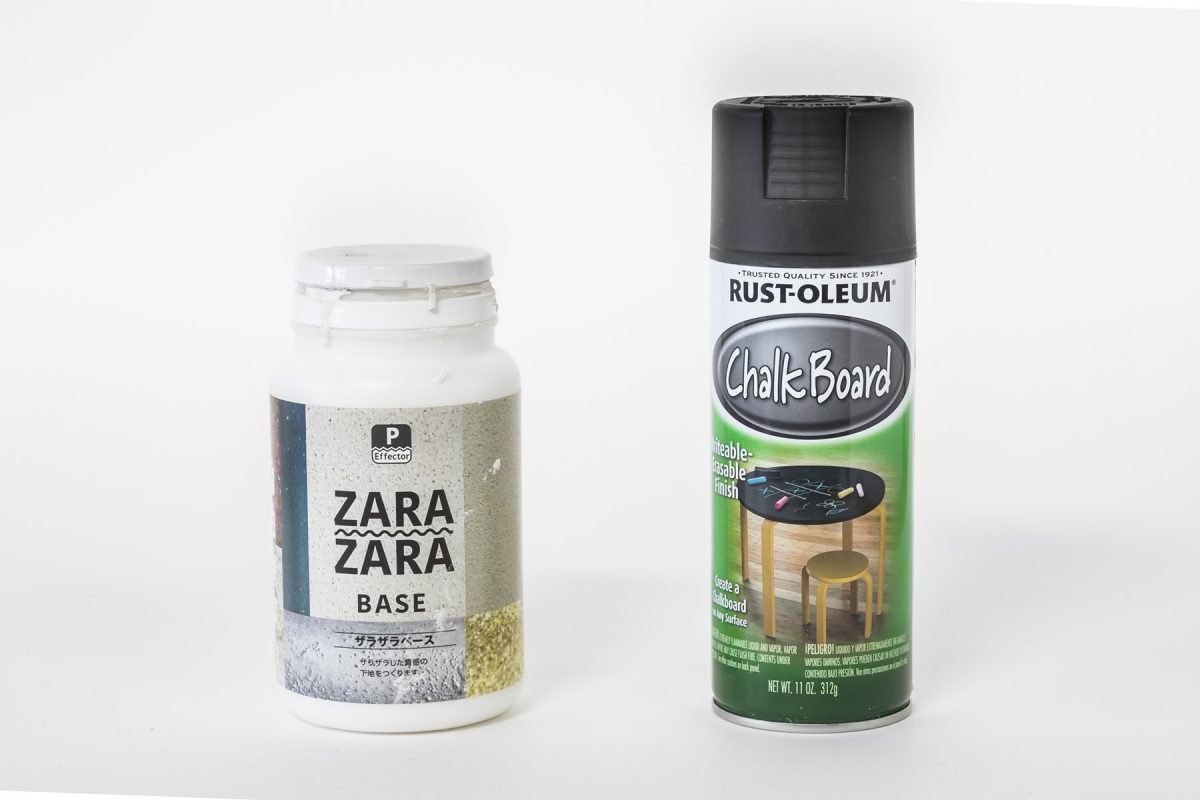 塩ビパイプに塗るザラザラベース(1080円)とチョークボードスプレー(約900円)を併用してホンモノの鉄のような仕上がりになる。