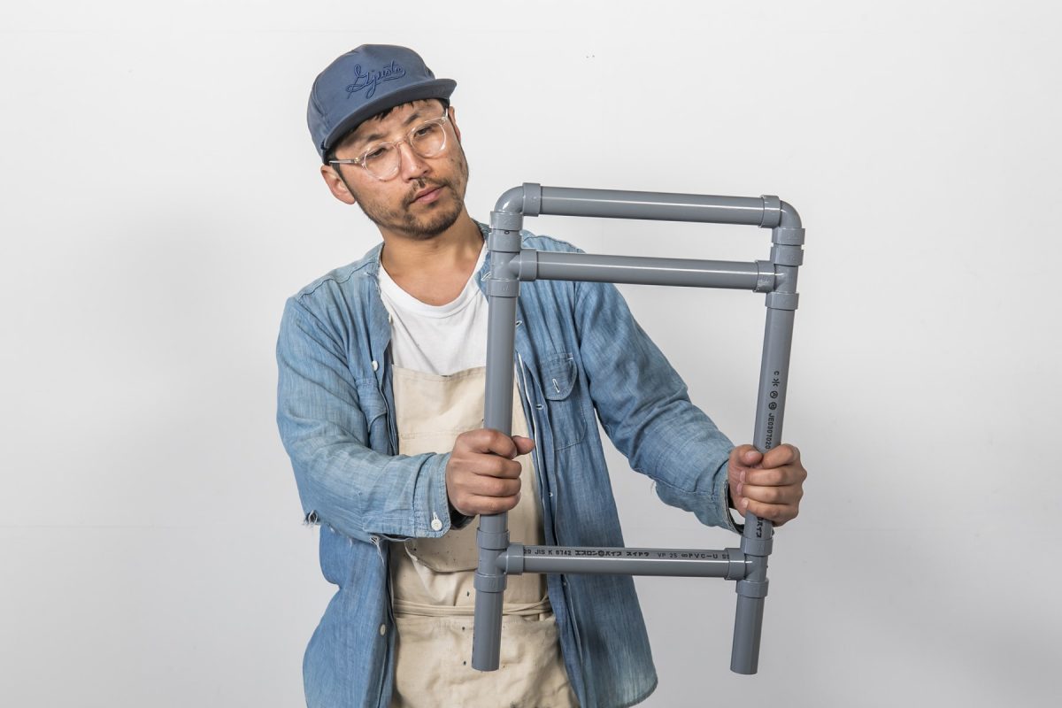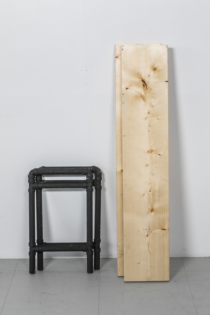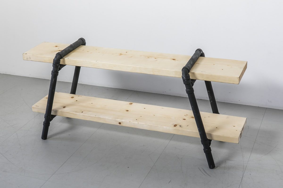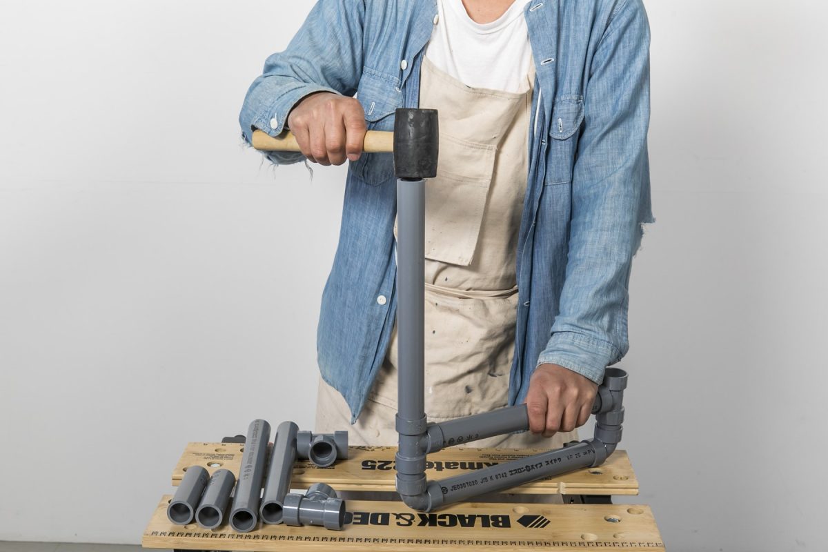 塩ビパイプのパーツを組み合わせて脚を作る。しっかりはめないと棚板を乗せたときに崩れてしまうので、ゴムハンマーを使って叩き込もう。