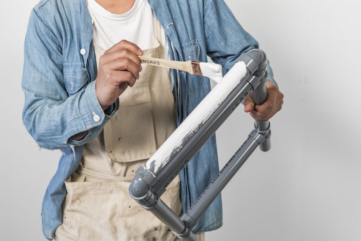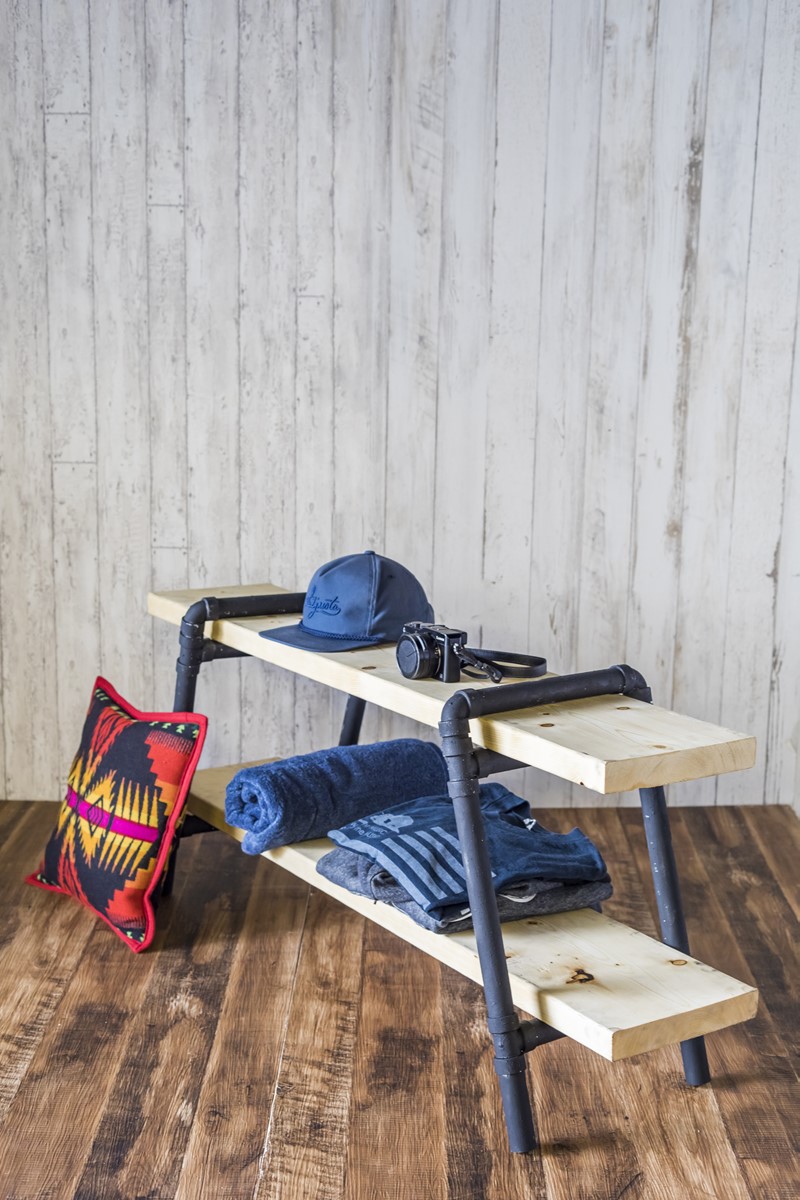 制作のポイントになるのは塩ビパイプを組み合わせて作る脚。長さの異なるパイプとそれらを接続するパーツをしっかりと固定させないと、棚を設置したときに崩れてしまうので注意が必要だ。またもはやDIYの基本ともいえる塗装にもこだわってみた。作り方自体はとても簡単なので、ぜひ挑戦してみて欲しい。