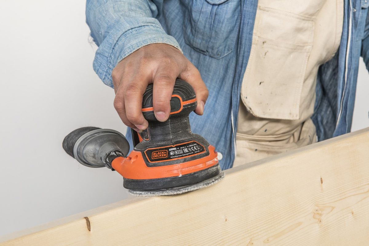 写真は18V コードレスランダムオービットサンダー。1万2000回/分の回転数の高速でムラのない研磨を実現したサ