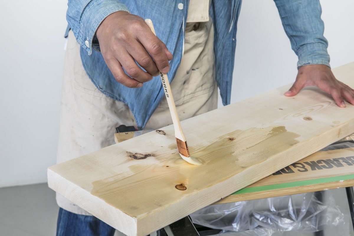 木目に沿ってワトコオイルを塗る。ワトコオイルを塗ることで、撥水効果が高まる。塗り終わったら乾かす。