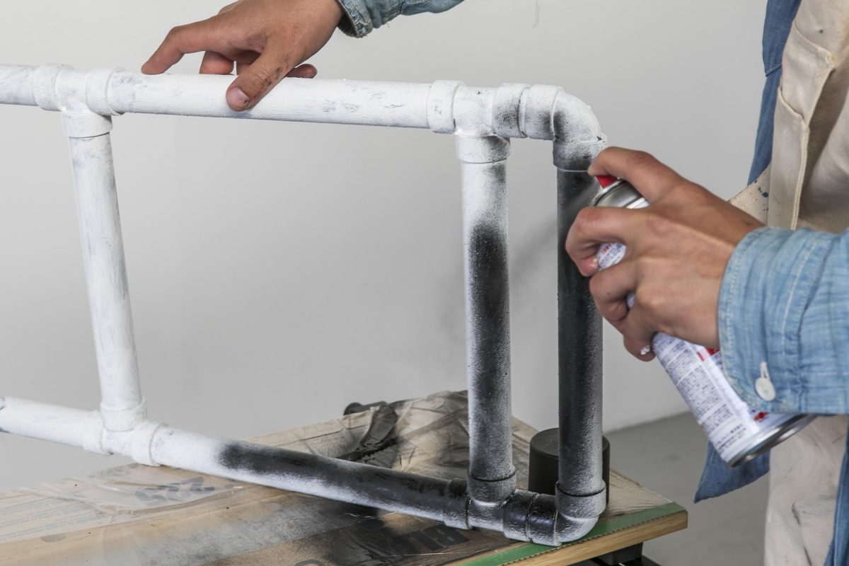 脚が乾いたらアイアン風に塗装する。今回はチョークボードスプレーを使用。隅々までスプレーしたら、再び乾燥。
