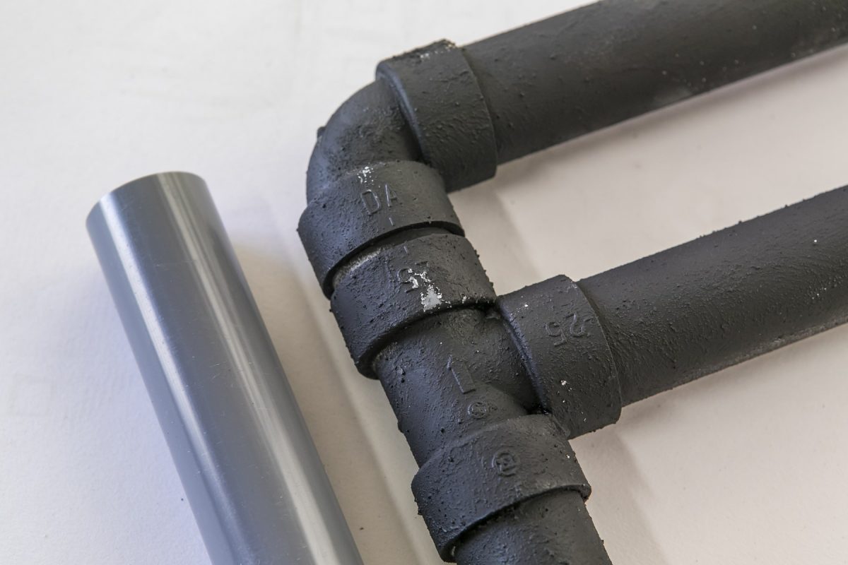 無機質な塩ビパイプがアイアン風に仕上がった。ザラザラベースがより効果を発揮しているのがわかる。