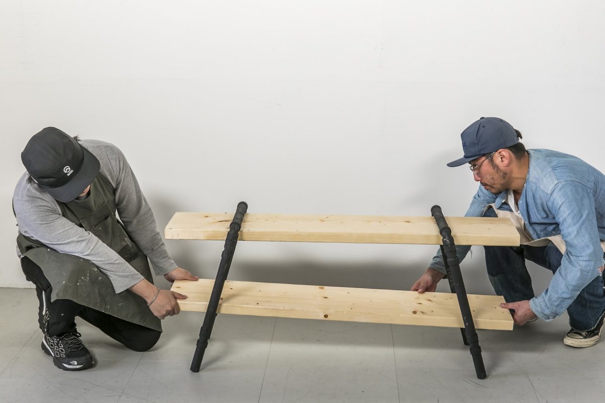 脚に棚板をセットする。脚の位置が左右対称でないと崩れてしまうので注意しよう。2人でやるとスムーズだ。