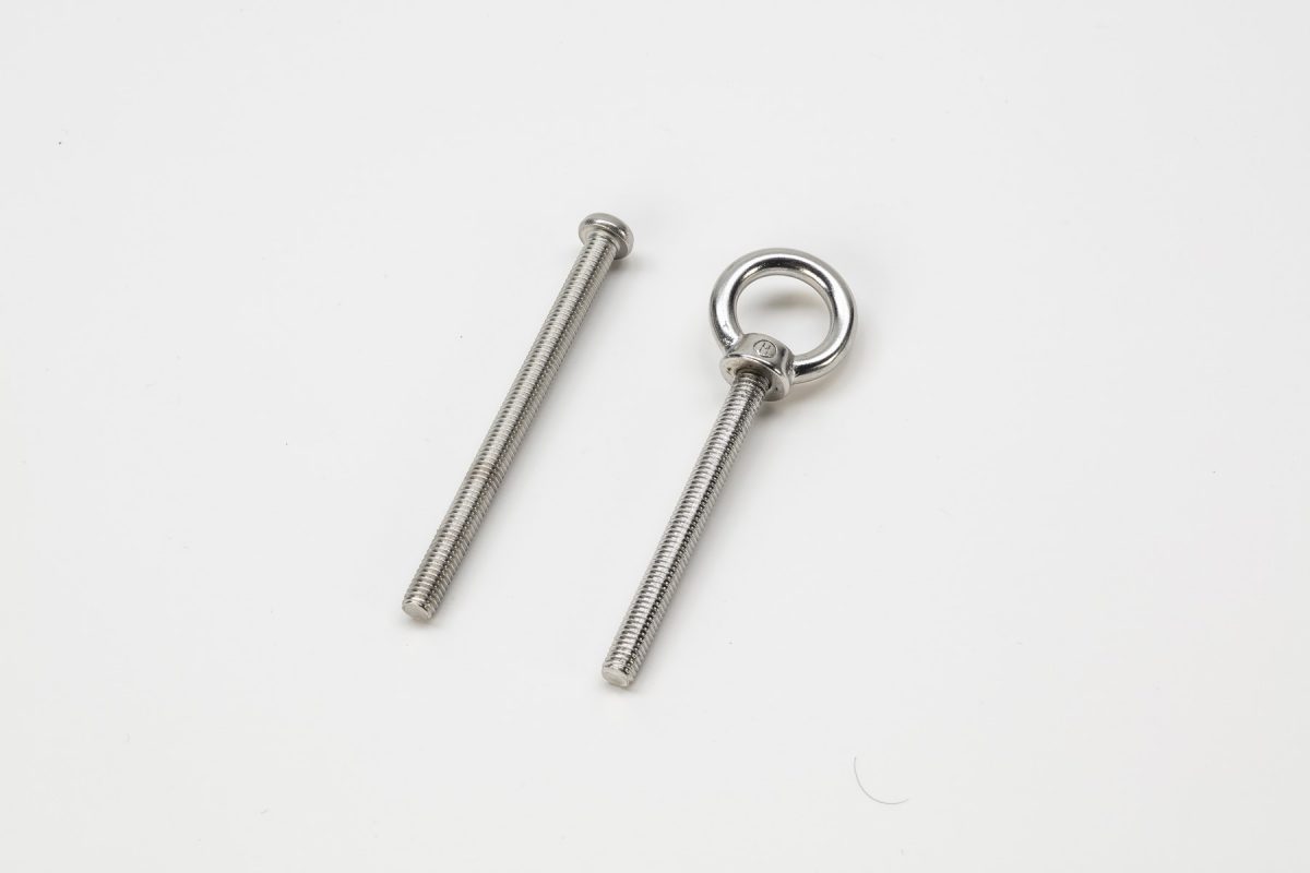 まず1本の丸棒にワッシャーを付けたなべ小ねじを通し、そのネジにロングアイボルトネジの輪っかを通す。