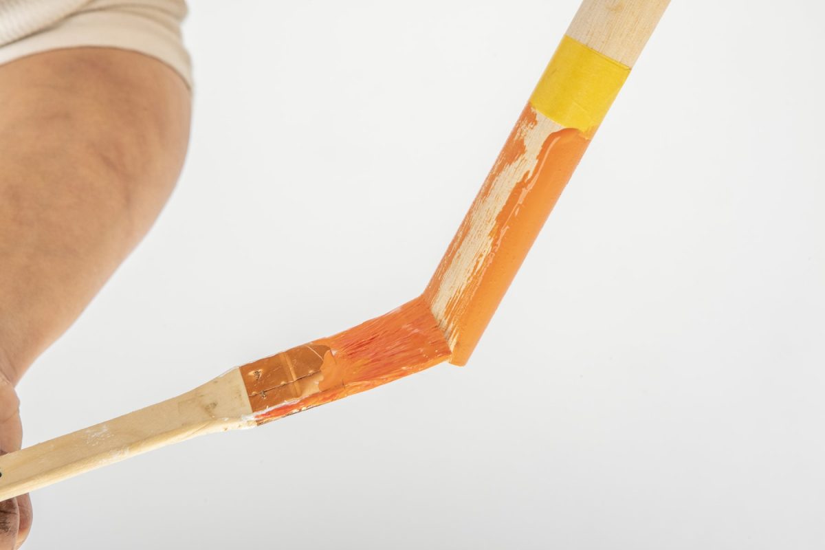 今回使用する色は、オレンジと水色の2色。まず先端にオレンジを、その下に水色を塗った。