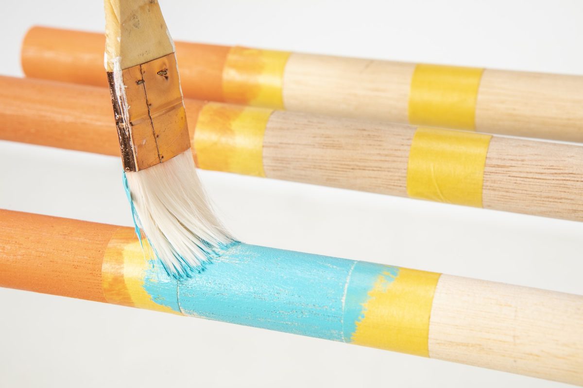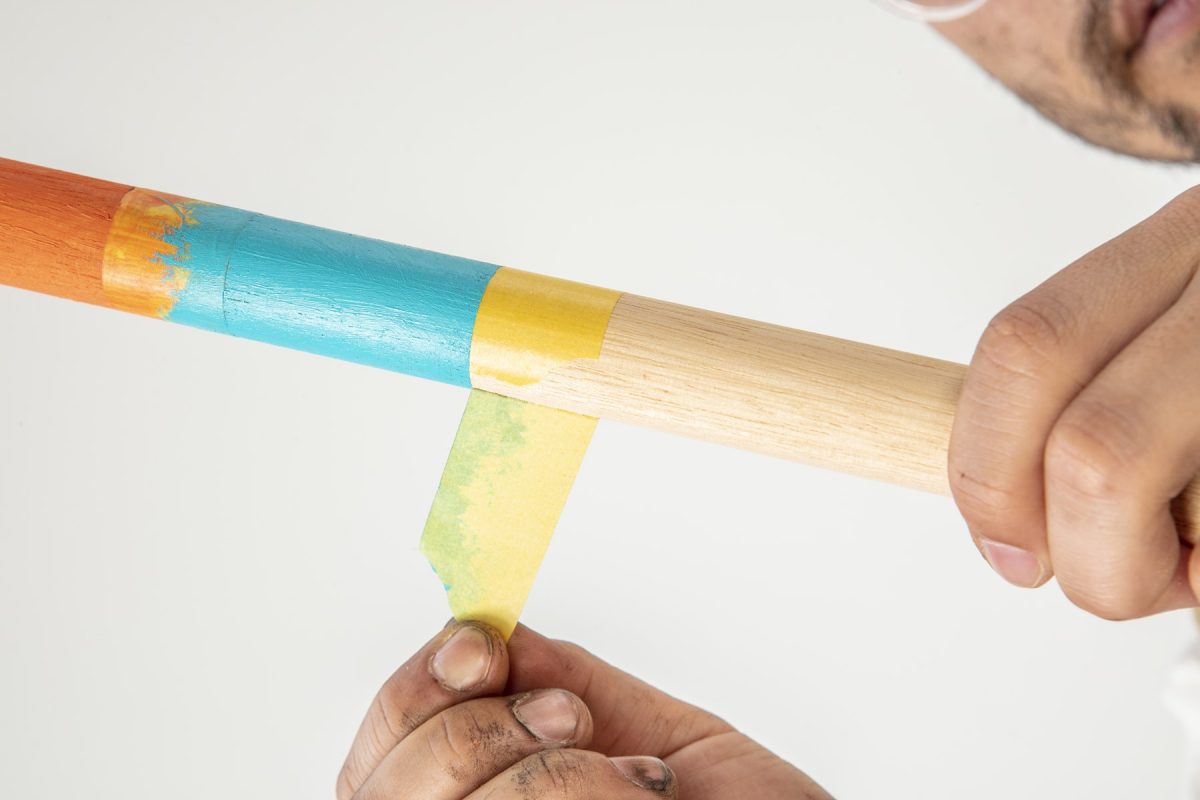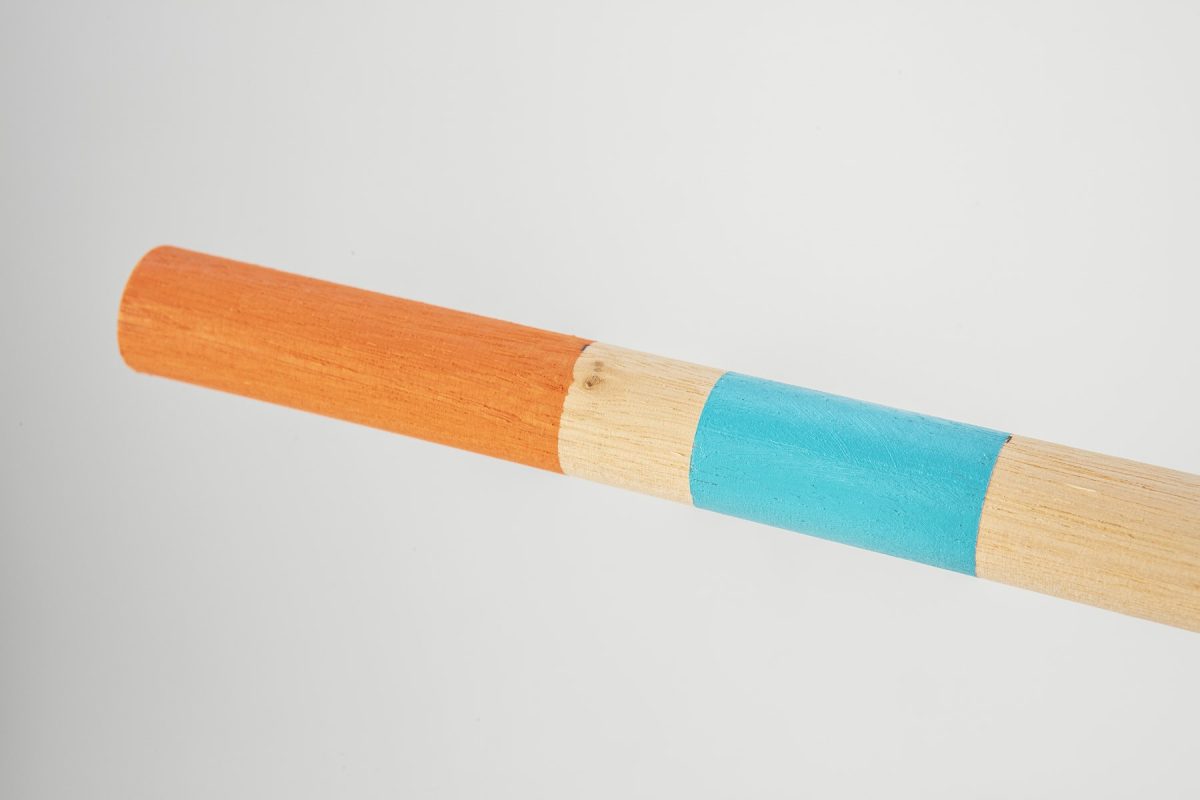 ペイントと穴を開ける箇所を決める。今回は2色使用するので、丸棒の先端から9㎝と16㎝の2カ所に印をつける。また20㎝のところには穴をあけ用の印をつける。