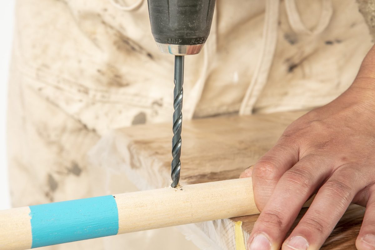 電動ドリルドライバーを使えば簡単に木材に穴をあけることができる。穴あけビットには穴の大きさごとに種類がある。今回は、M6ネジを通すための6㎜の穴あけビットを使用する。