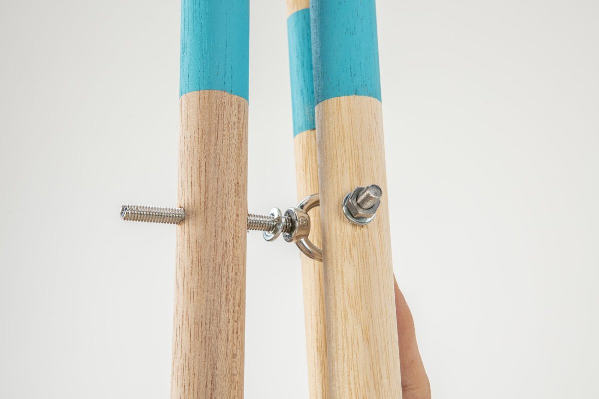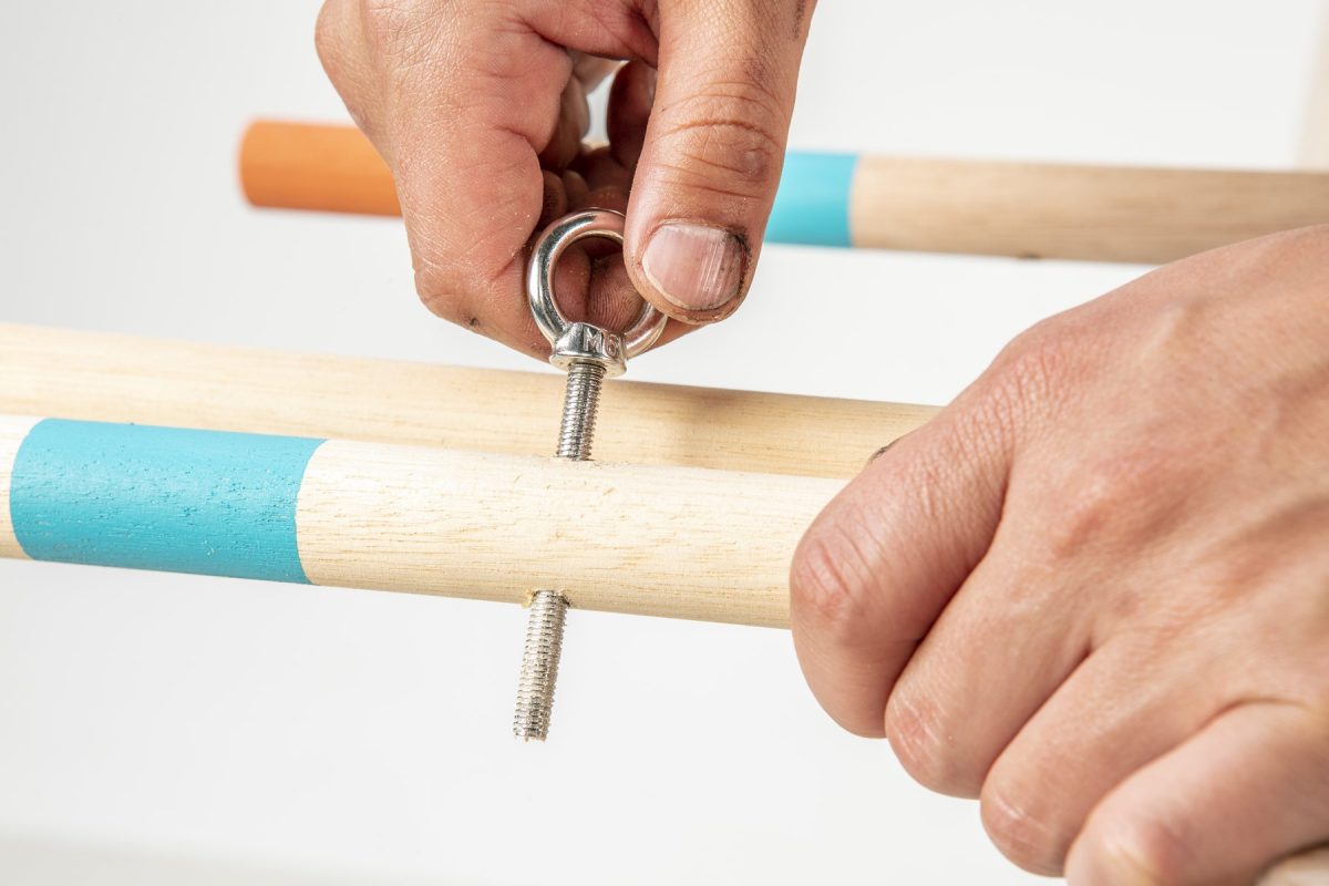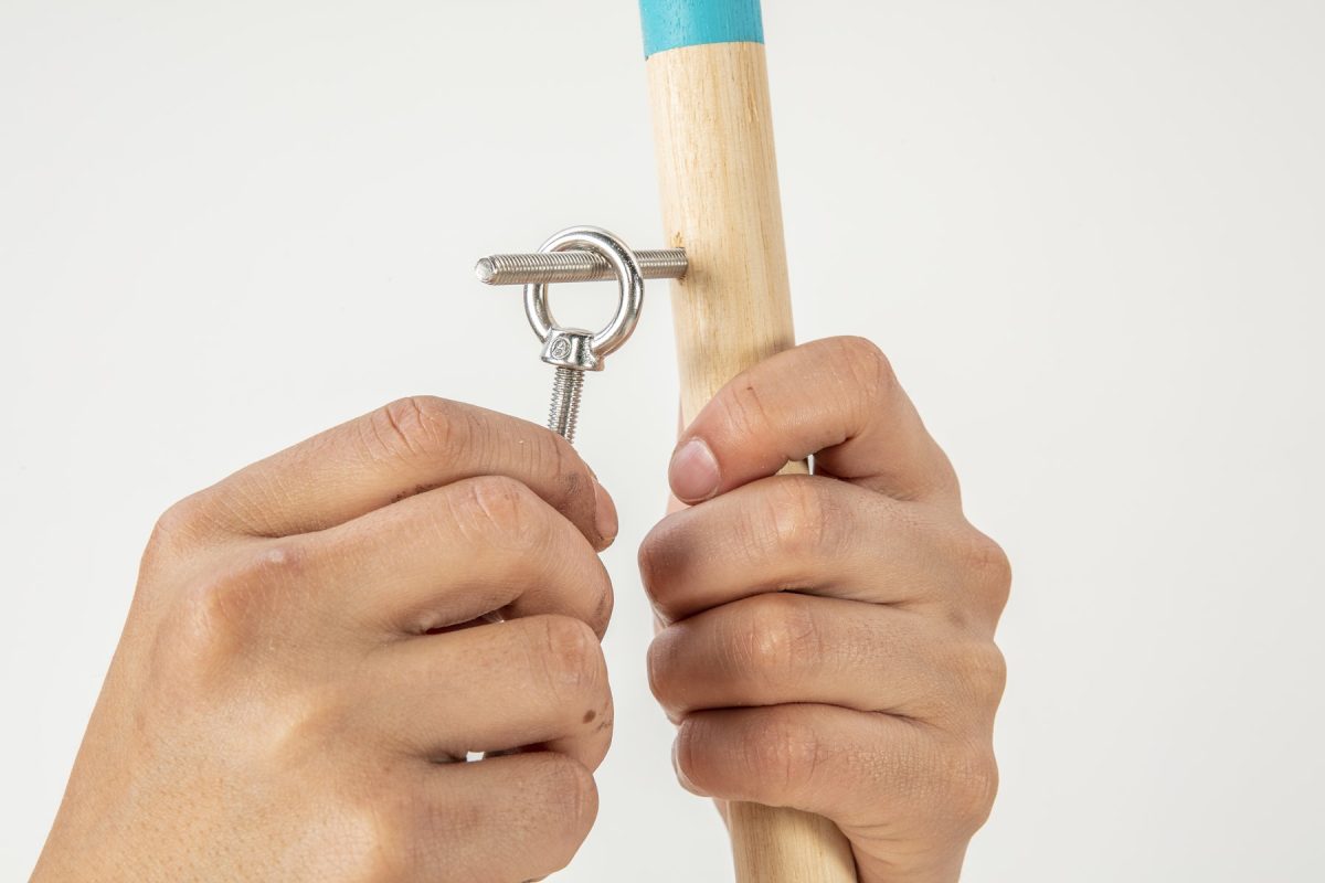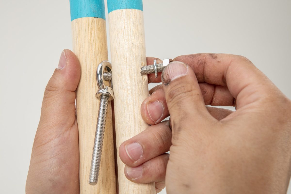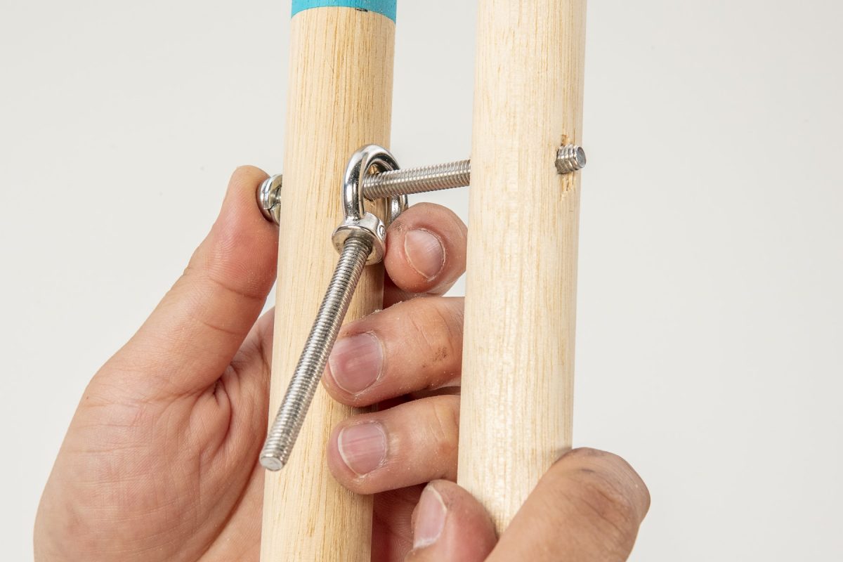 ロングアイボルトネジを3本目の丸棒の穴に通して、ワッシャー、ナットの順に通して固定する。
