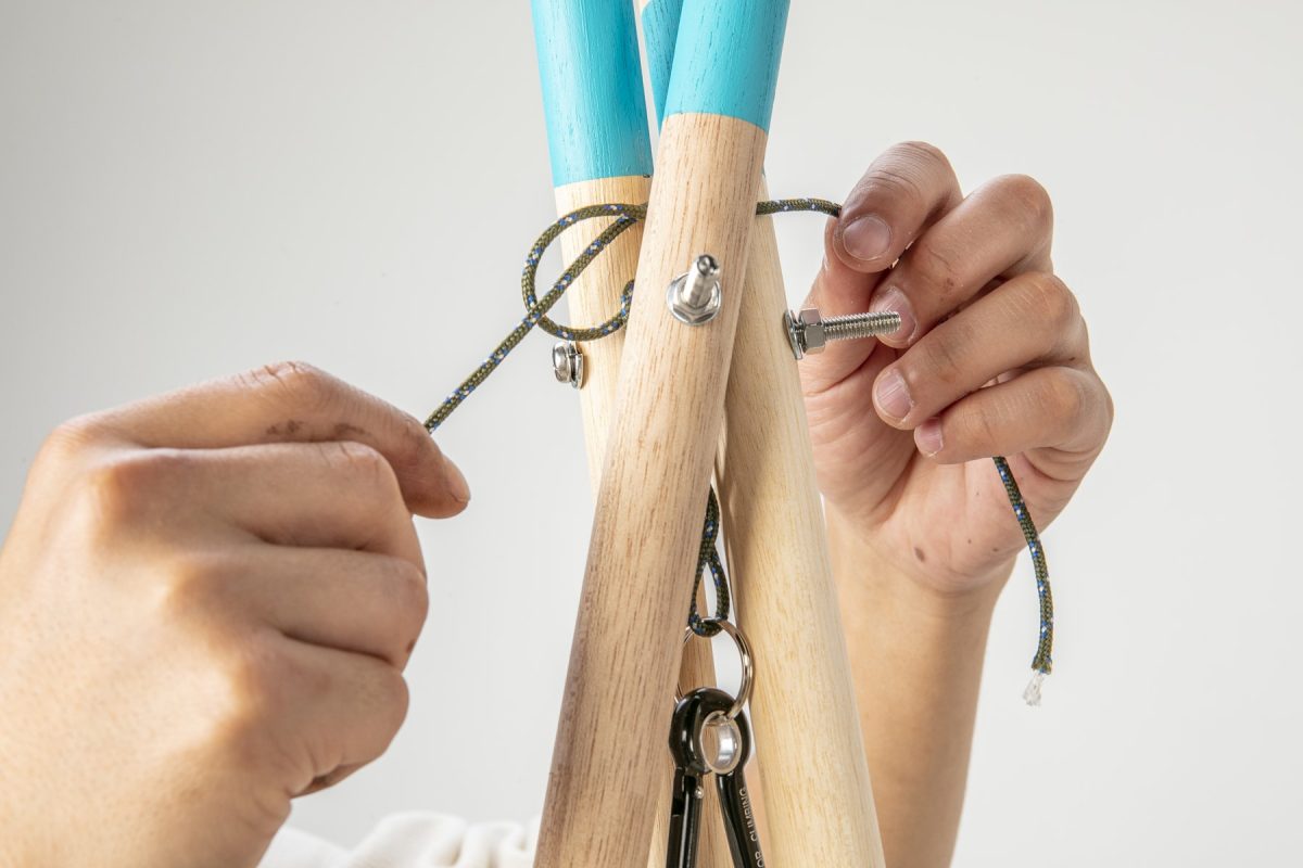 パラコードを3本の丸棒の隙間に通して、ネジに結びつける。