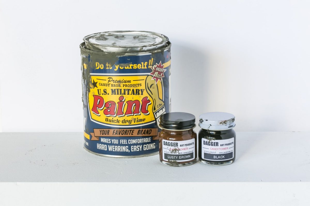 戦車色に塗れるアーミータンクグリーンのキャンディータワーのペイント(約5000円)と、錆と汚れ加工用ペイント(各約1300円)を使う。