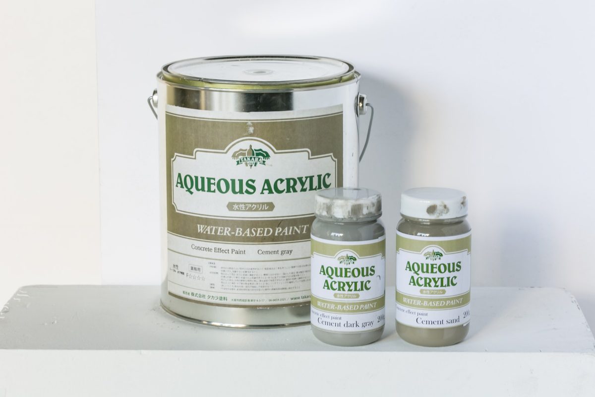 コンクリートエフェクトペイント。グレーをベースに塗り、ダークグレイとサンドを斑に塗ると自然な仕上がりになる。約1万円