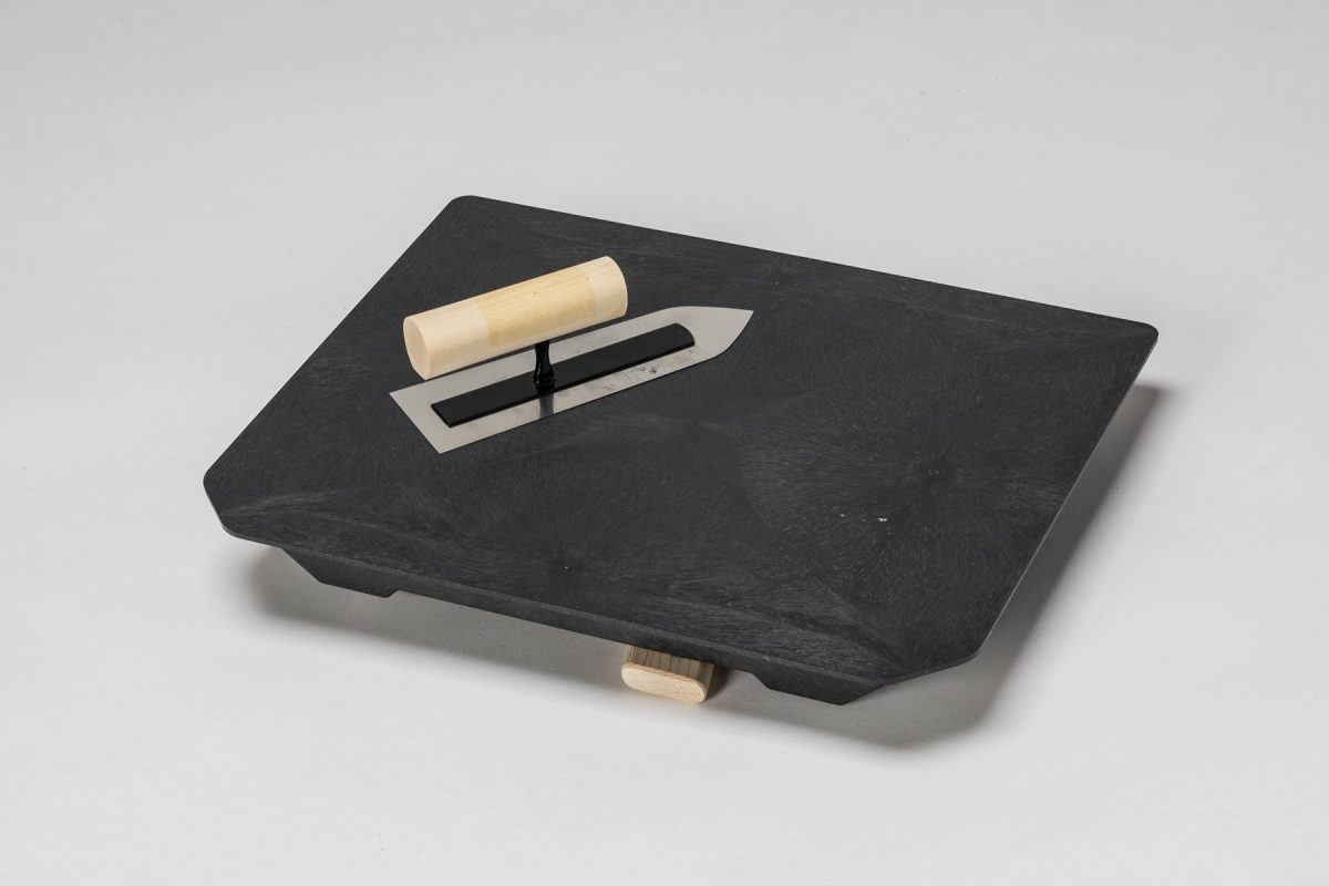 珪藻土を乗せるコテ板。珪藻土が落ちないよう、表面に滑り止めが付いている。コテは握りやすいものを選ぼう。コテ板約1600円、コテ約1260円