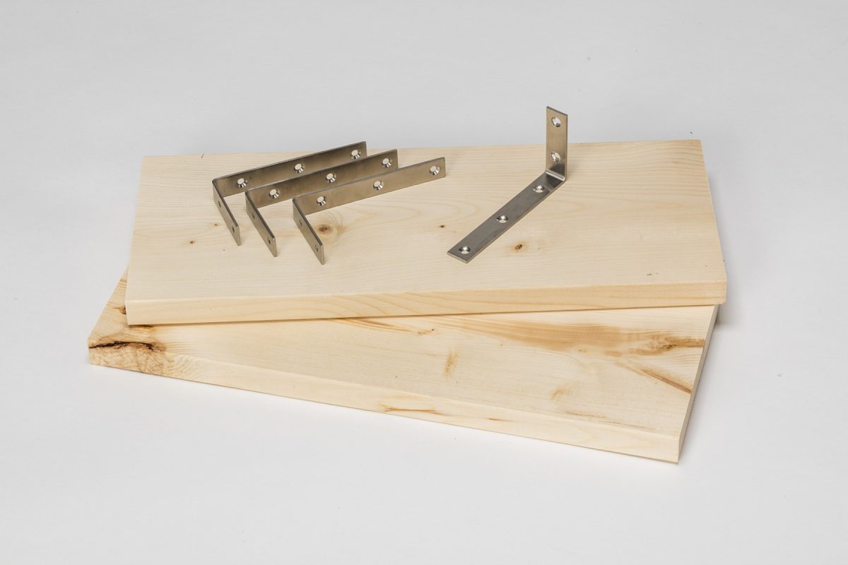今回は棚も設置する。壁に付ける小さな棚の材料がこちら。139×50×18㎜の1×4材を付けたい枚数分用意。またL字アングルを板の枚数分×2個。ビスも準備。板3枚約960円、アングル8個約2600円