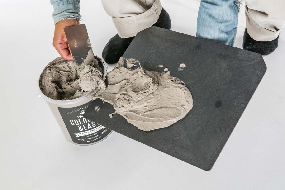 今回使ったのはCOLORFUL &EASY の珪藻土。水と混ぜたりしなくてもそのまま使える。基本色が20色と豊富で、匂いも少ないので住みながらDIYが可能。約6500円