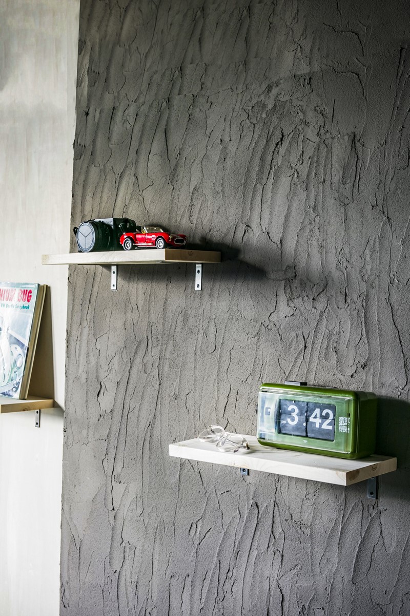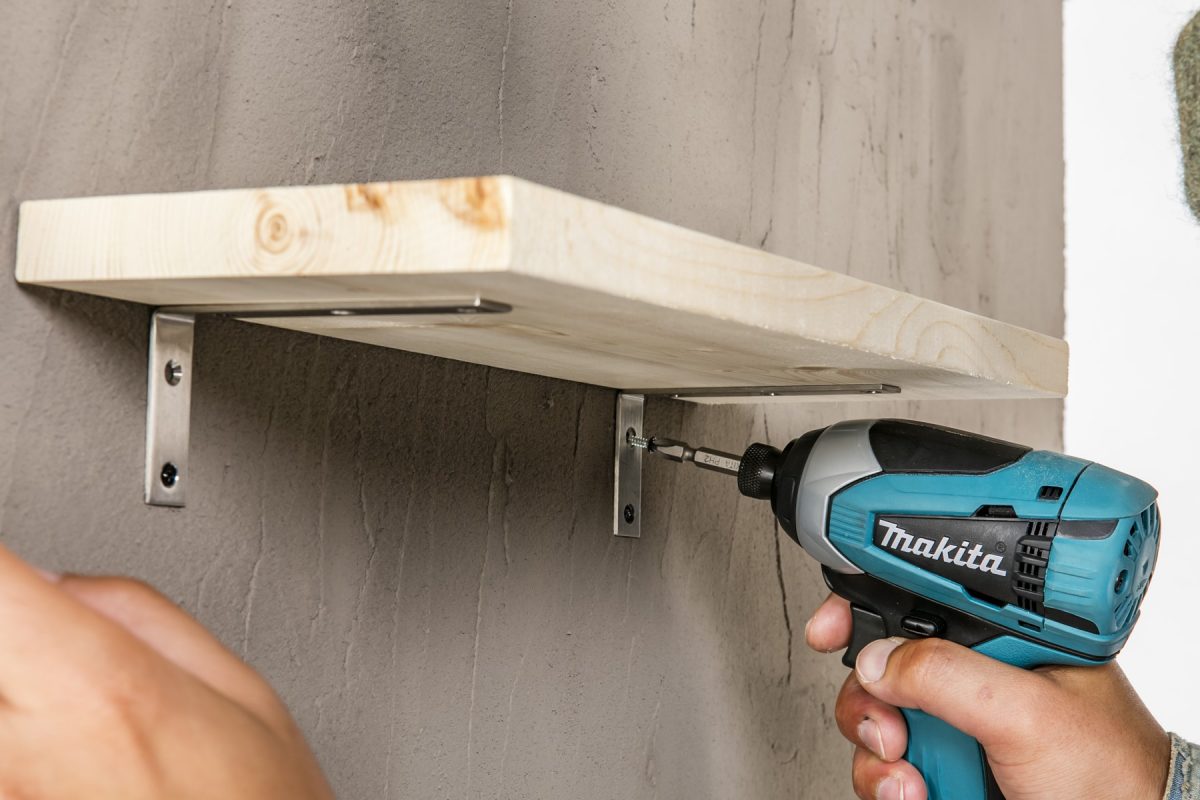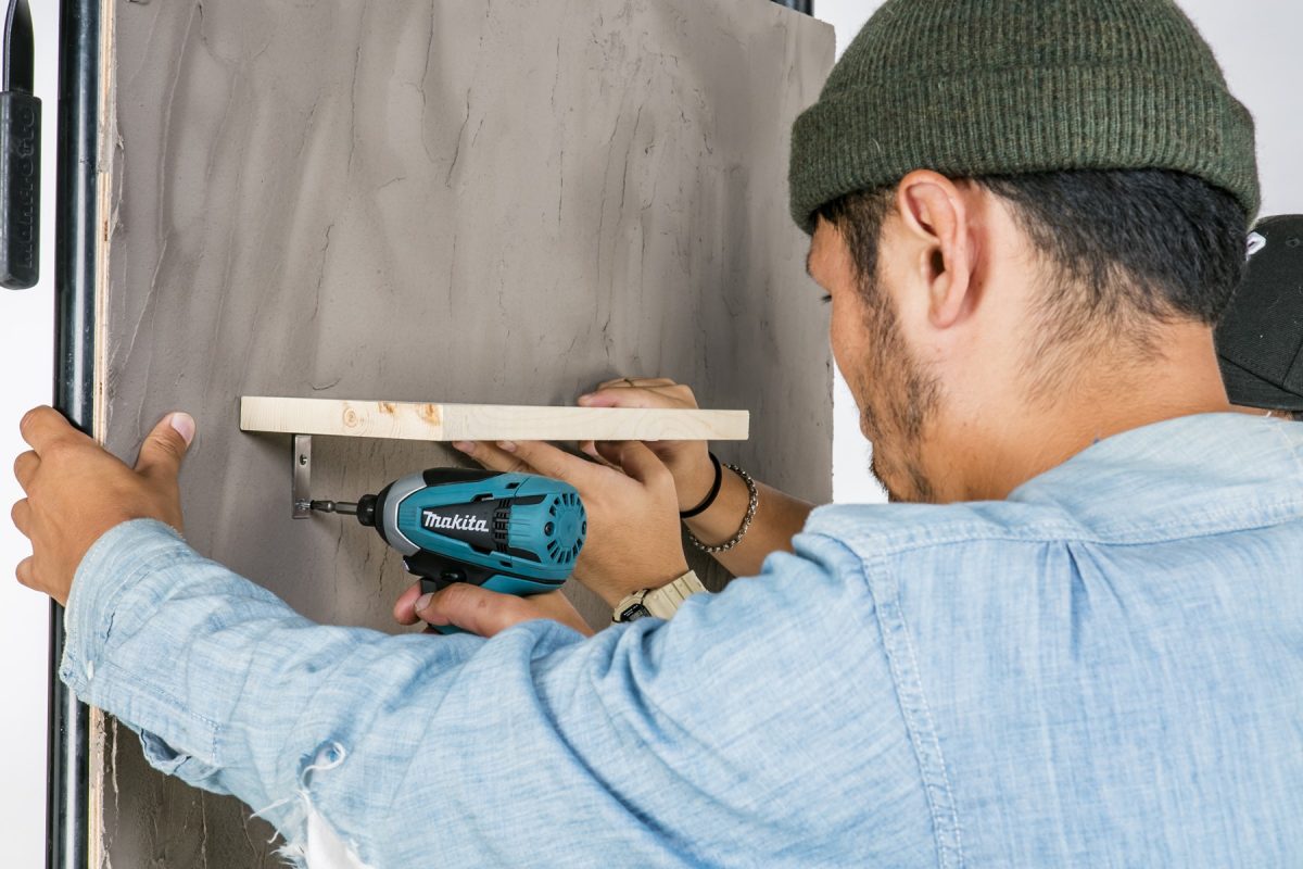 板が水平になったら、もうひとつのL字アングルで板を固定する。他に棚を付けたい場合は、同じ手順で設置すれば完成。今回は板にペイントなどしていないが、好みでワックスなど塗ってもいいだろう。