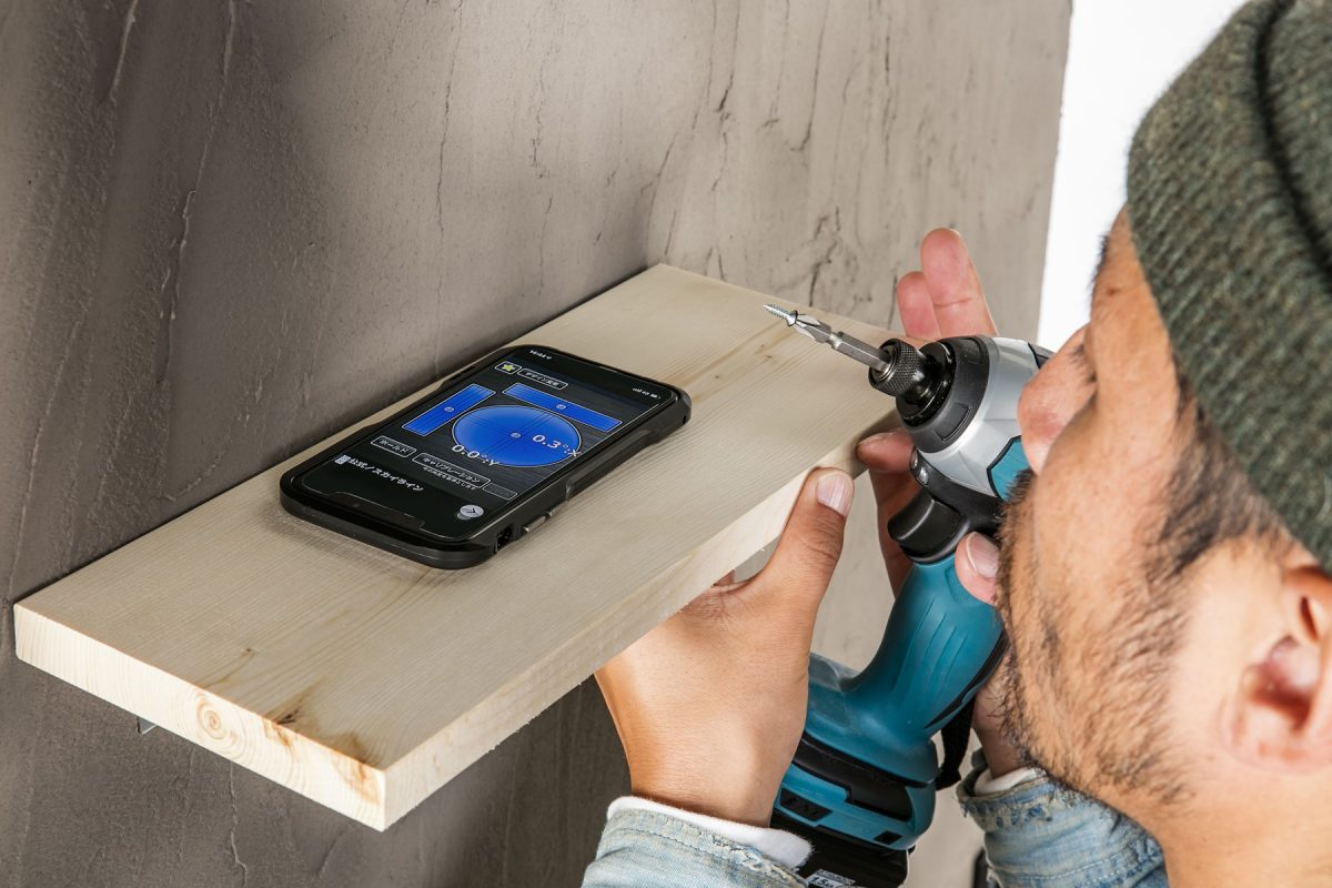 棚を水平にするため、水平器を板に乗せて調整する。今回は、スマホのアプリを使って水平を調整してみた。