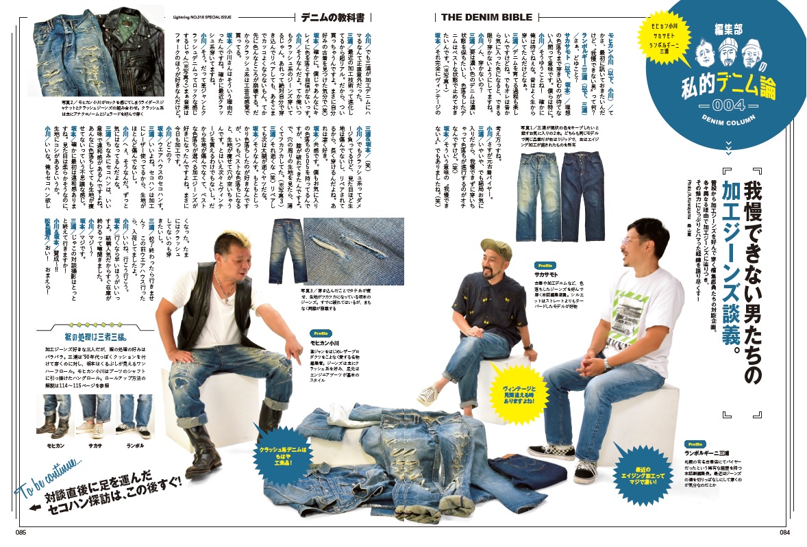 今回もデニムには一家言ある編集部員たちがいろいろな角度からデニムについてアプローチしたコラムを収録。対談に始まり、実際に見てきた世界のデニム事情、そして自ら新しいデニムを新調するレポートまで。放っておけば2時間でも3時間でも熱くデニムについて語ってしまうライトニング編集部のデニム愛をぜひチェックしてみてください。
