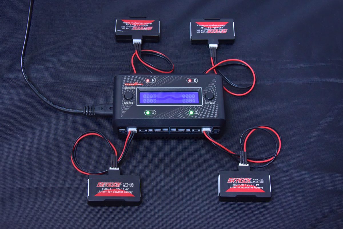 ドローンサッカーの練習に最適な全長20cm の小型ドローン「スカイキック」用の充電器。4つのバッテリーを同時充電できる優れもの。