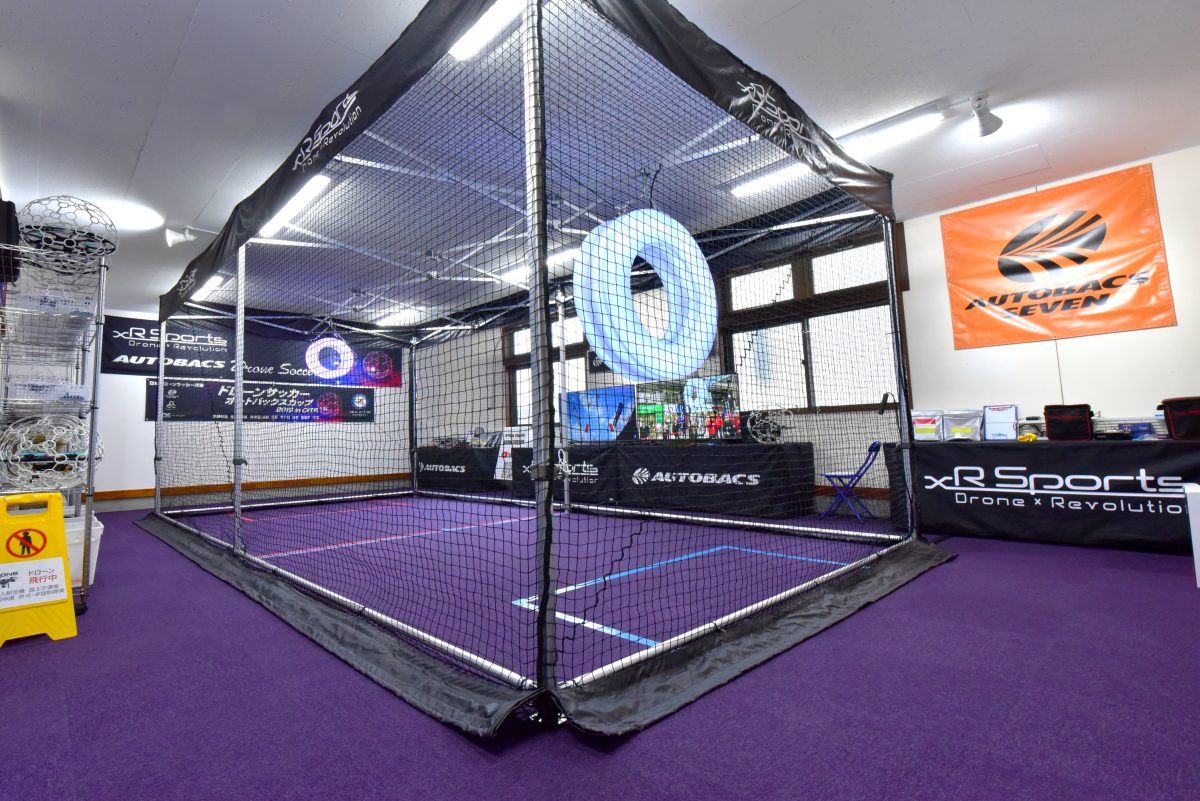 ドローンを安全に飛ばすためとゴールを吊るすためのケージが必要。今後は全国のフットサル場などに導入されていく予定だ。