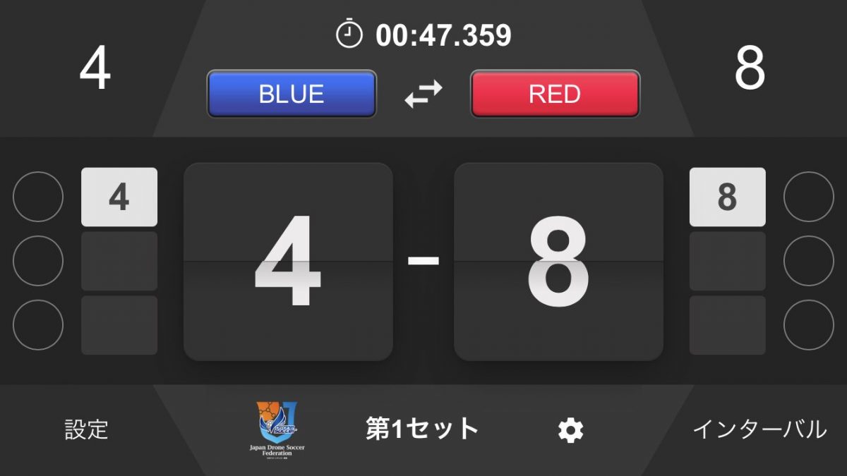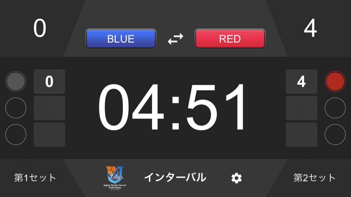 ドローンサッカー専用の公式スコアボードアプリで、試合中に画面をタップすればスコアの数字を変更でき、試合時間やインターバルタイムも変更可能。また延長戦やPK戦にも対応している。得点状況や獲得セット数、そしてチーム名も常時表示されるので、大画面に映し出せばギャラリーも試合状況がわかるという優れもののアプリだ。ダウンロードは無料。現在はiOSのみの対応となっている。