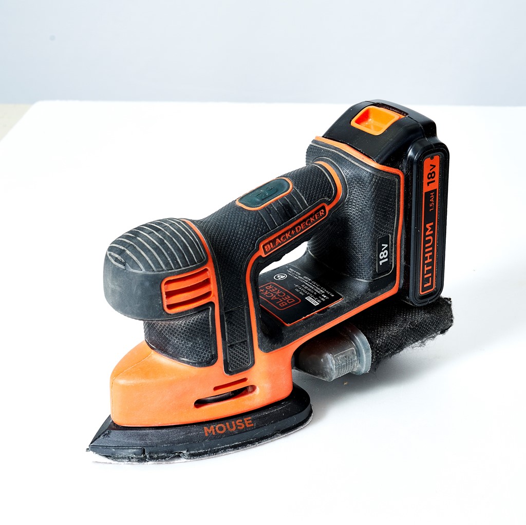 木材の表面をサンディング(研磨)する工具。表面が滑らかになると同時に、サンディングすることでワックスが染み込みやすくなる。