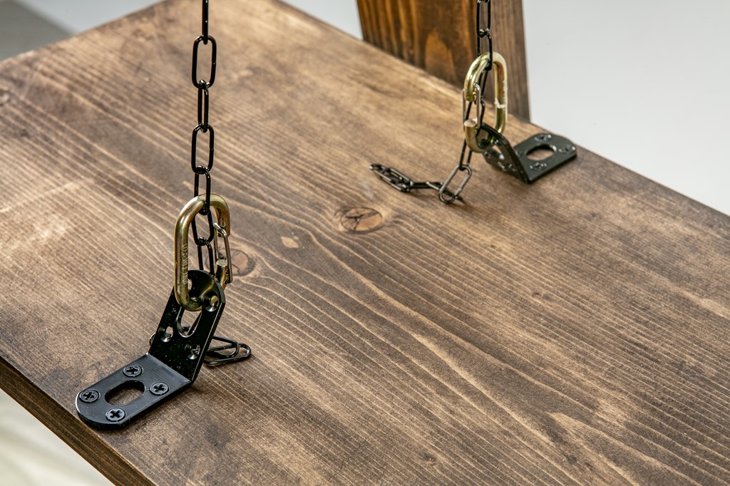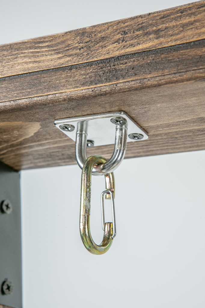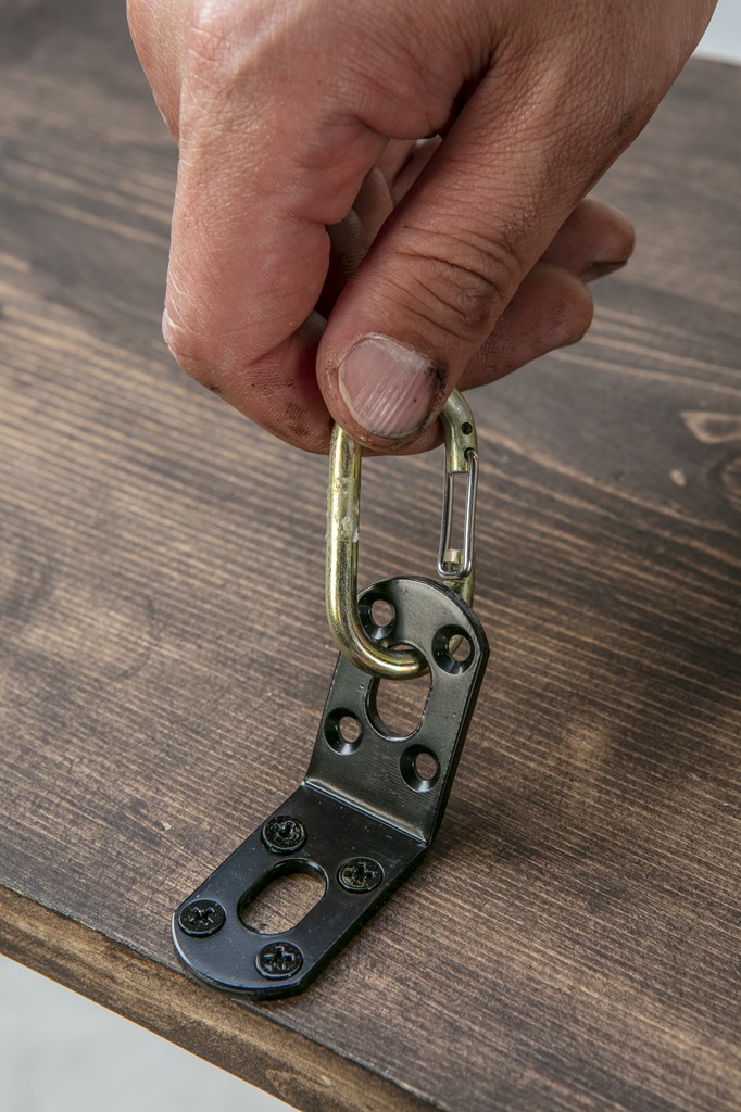 テーブル板を吊り下げるチェーンを接続するためのリングプレートを天板に装着。2箇所装着したらカラビナを写真のようにセットする。