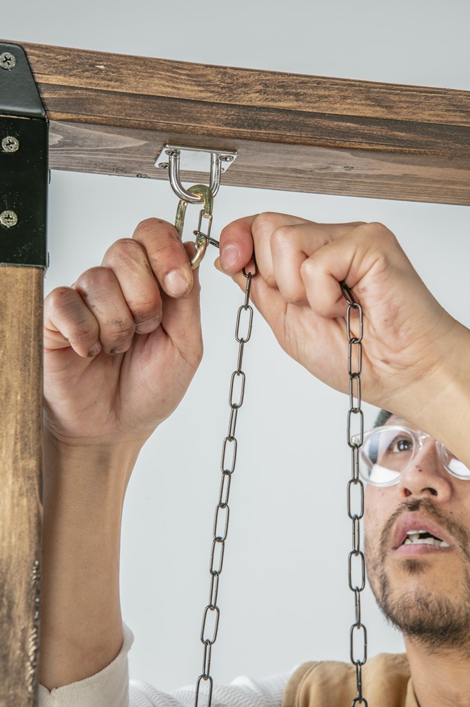 それぞれのリングプレート側のカラビナには2本分のチェーンを、また各アングル側にはチェーンを1本ずつ装着してテーブルを吊り下げる。