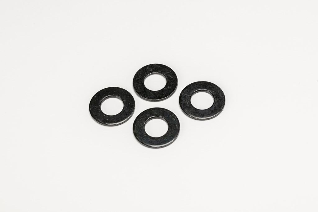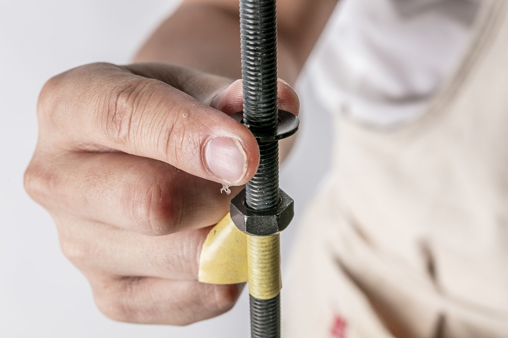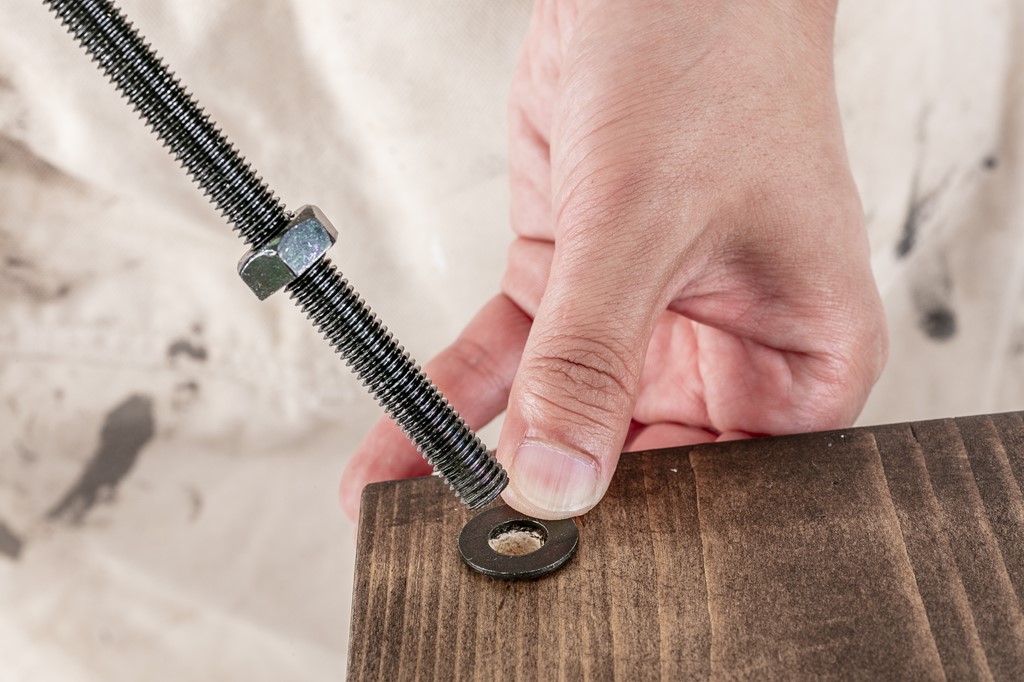 全ネジに座金、六角ナットの順に通して、板をしっかりと固定する。固定できたらマスキングテープをはがす。