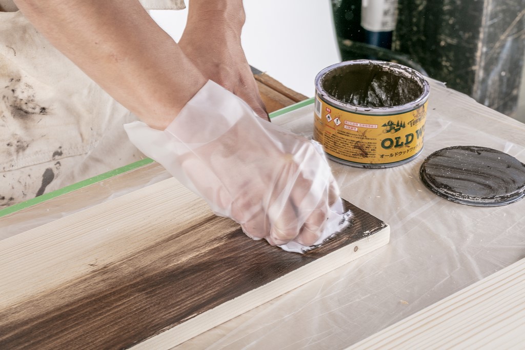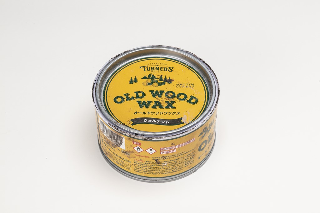 サンディングしたら、オールドウッドワックスを少しずつ塗り、ウエスを使って余分なワックスを拭き取り乾燥させる。