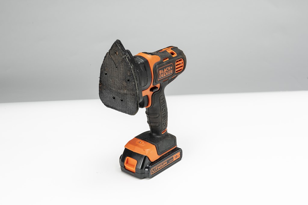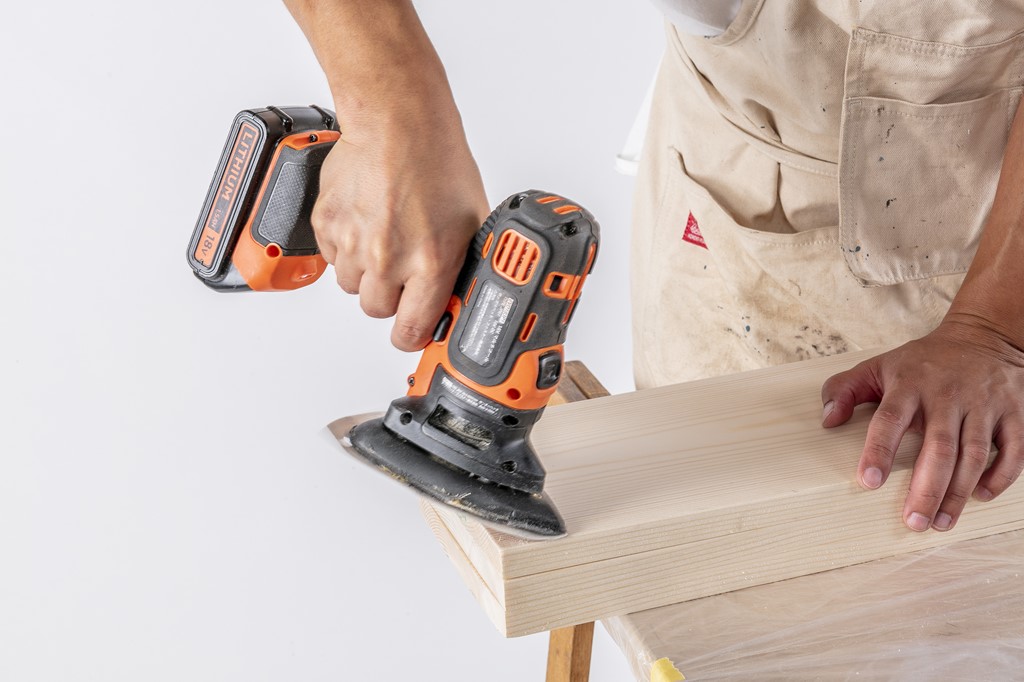 木材をサンディングするときに使用する電動サンダー。表面を滑らかにすると同時に、ワックスを染み込みやすくするDIYの必需品。