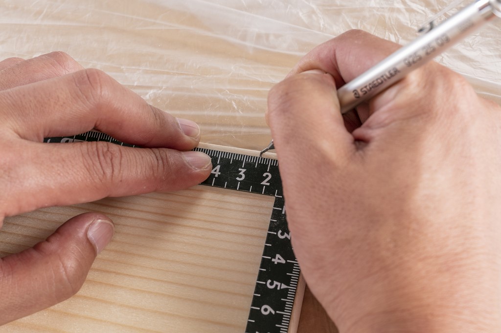3枚目も同じように四隅に穴を開けたら、4本の全ネジが木材に通るか一度確認してみよう。