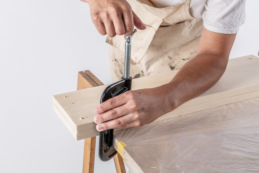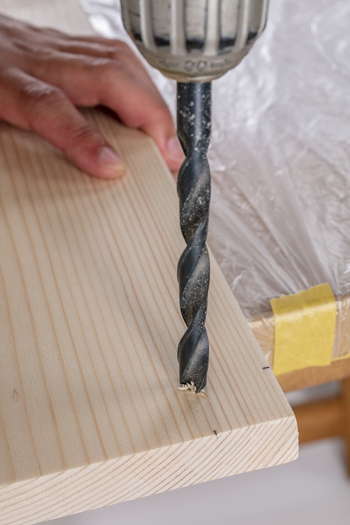 1枚目の板に穴を開けたら、2枚をぴったりと重ねる。クランプで机と板を固定すると、作業がしやすくなる。