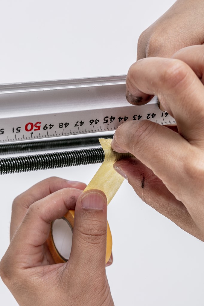 2段目の位置を決める。今回は下から450㎜の箇所にマスキングテープで印をつけ、六角ナットと座金をセットする。