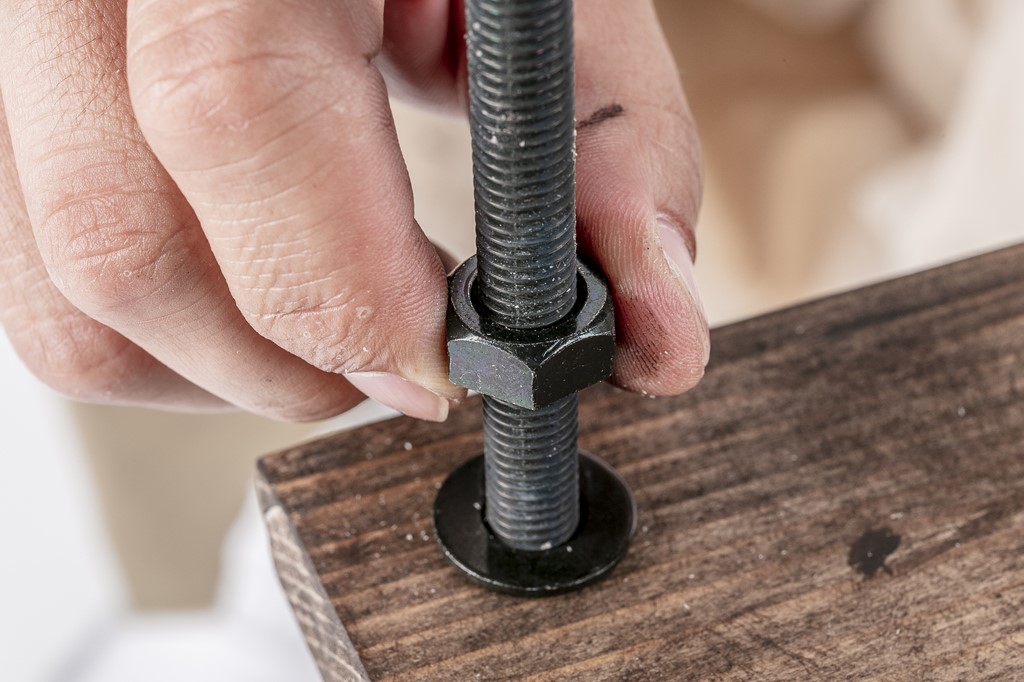 全ネジを通したら、先端に高ナットをセットして脚を作りしっかりと固定する。これを4本分行う。
