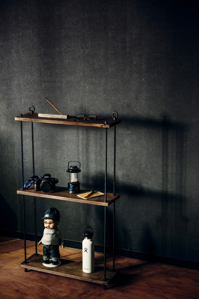 そこで、今回はブラックの全ネジを使ったボルトラックを制作してみる。いかにもパーツっぽい全ネジをラックの支柱に使い、古材テイストに仕上げた板を組み合わせることで、男らしくざっくりとした仕上がりになる。このラックのよいところは全ネジを使っているので、好きな場所に棚を付けられること。しかも、あとからいくらでも高さを変更できるので、置きたいものの高さが変わっても、簡単に調整できる。
