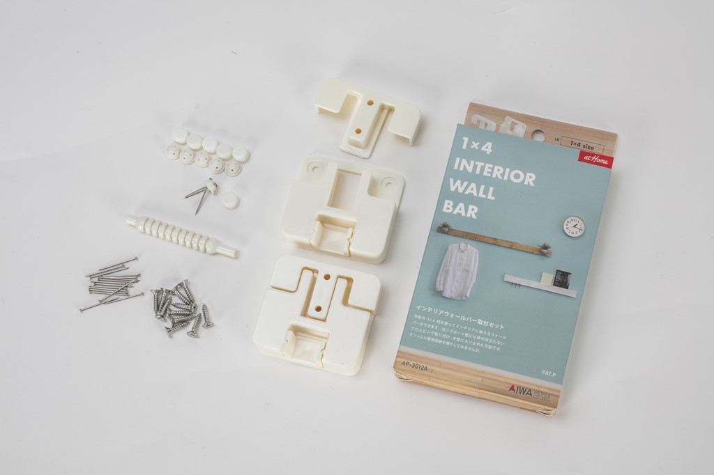 使用する木材や塗料、部品がすべて揃った便利なキット。内容は長さ400㎜の1×4材が1枚。木材に塗る塗料は、ペーパーに塗料を染み込ませたペーパーステインを使用。メープル、ウォルナット、チークの3色から選べるのも嬉しい。留め具にピンを使ったインテリアウォールバーとオプションパーツを使用。取り外した跡が目立ちにくいので、賃貸でも安心して使える。1980円。https://www.diyfactory.jp/roommakit/