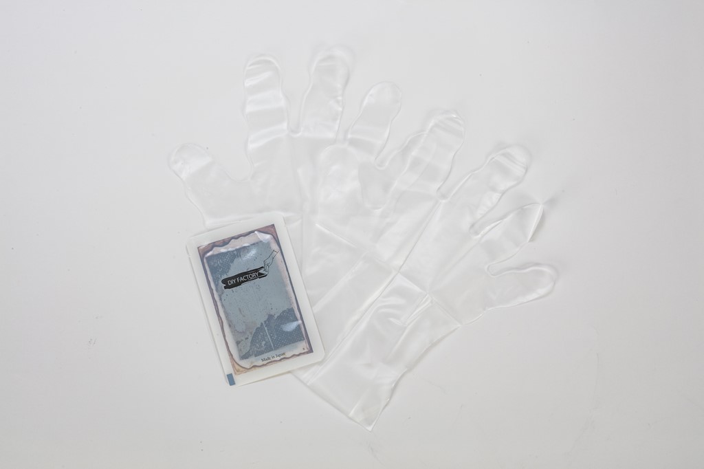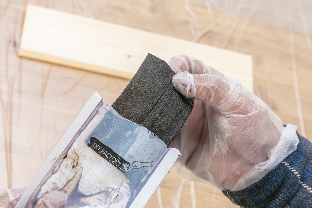 付属の手袋を付け、ペーパーステインを開ける前に袋ごとしっかりと揉み込み、塗料がはねないようにゆっくりと開けて、中のペーパーを取り出す。