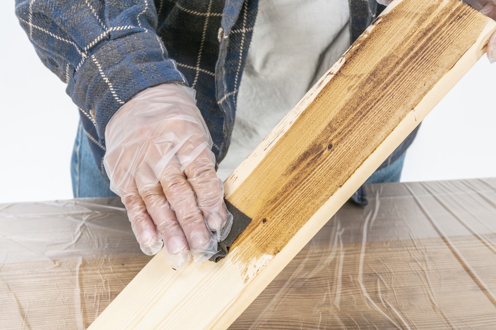 1×4材を持ちながら、優しくなでるように全体に塗る。濃いめにしたい人は、2〜3回塗り込んでみよう。