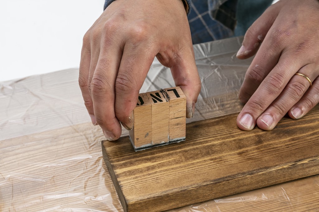 塗装した木材にスタンプしてアレンジ。今回はスタンプを使ったが、ステンシルなど別のものを使ってもいいし、使わなくてもOKだ。