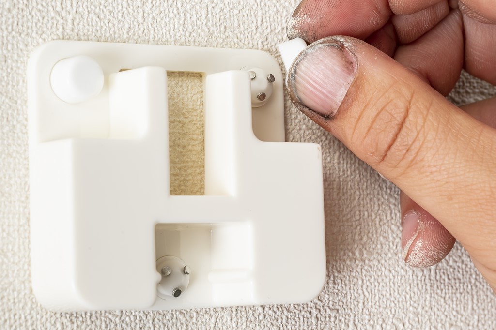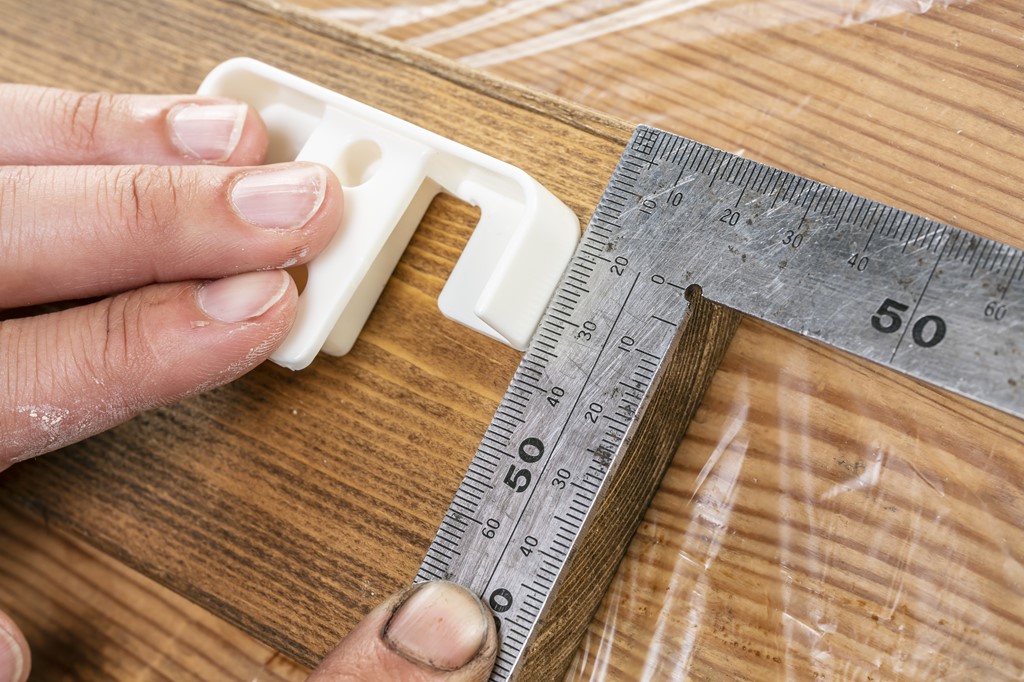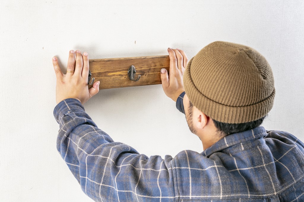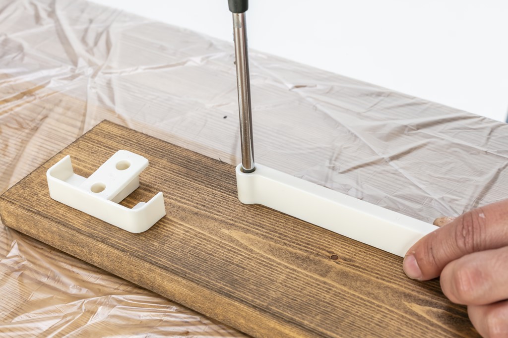 木材から壁側パーツを外して、先ほどの目印に合わせて壁が石膏ボードならピンで、木壁ならネジで取り付ける。