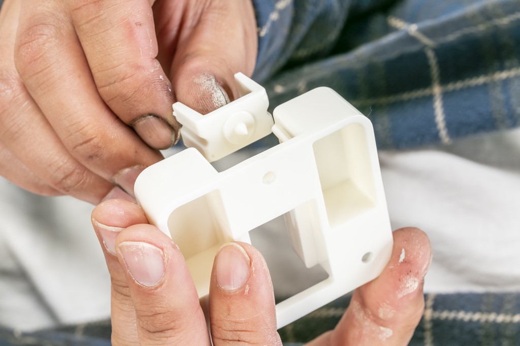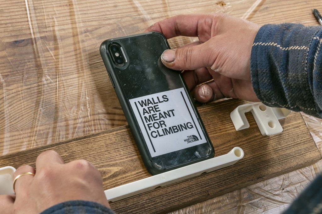 壁側に装着するパーツにはピンやネジを差し込むための目印を付ける突起がついている。これを木材側のパーツにはめる。