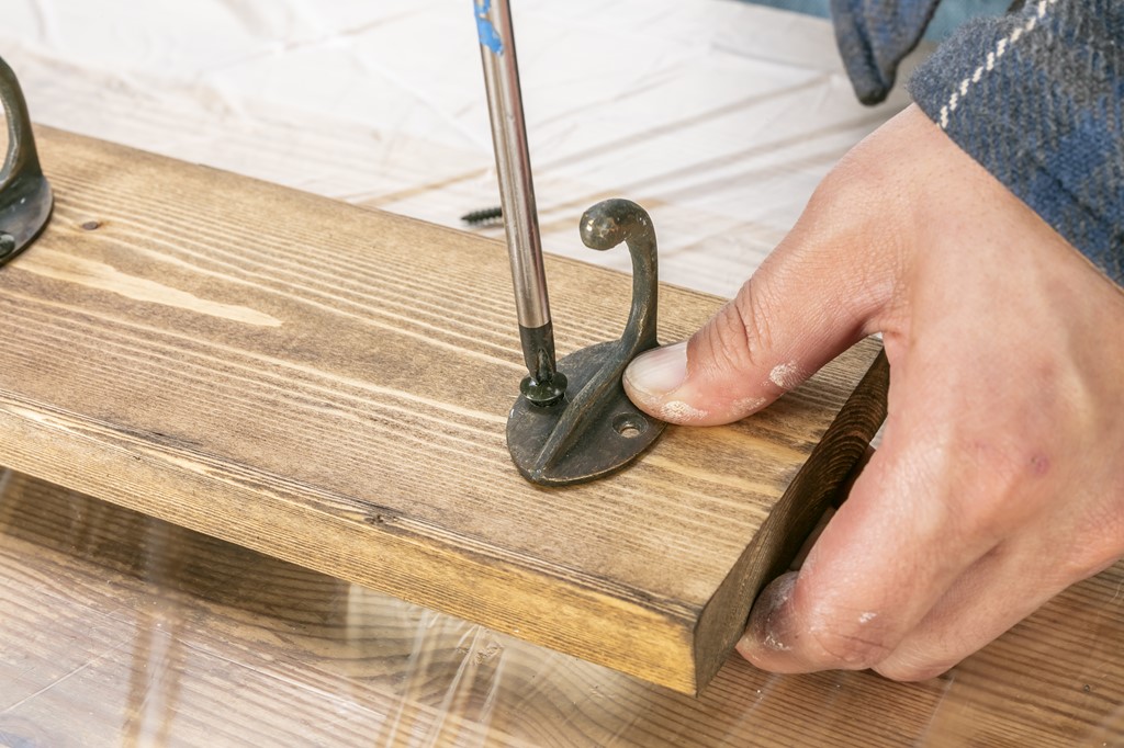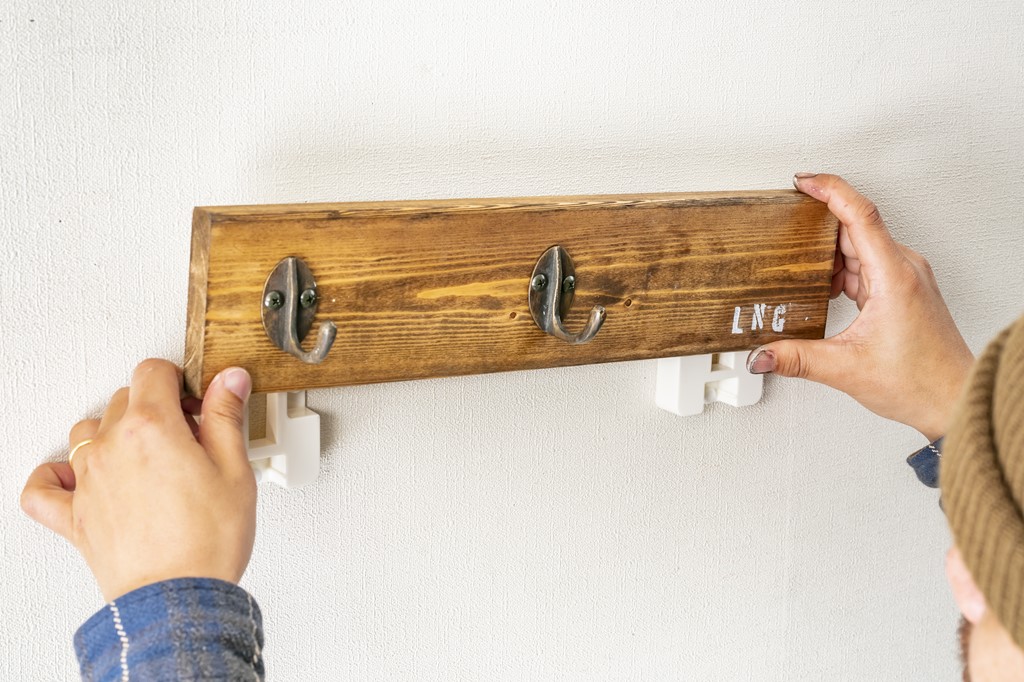 フックの位置を決めてネジで固定する。引っ掛けたいものに合わせて場所を調整するが、最大3つまでがちょうどいい。