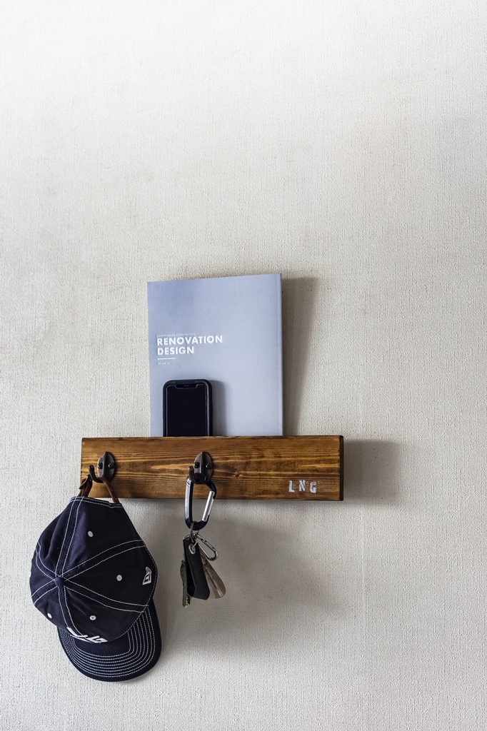 玄関やリビングにあると出掛けるときに必要な帽子や鍵などをすべてここに収めることができて便利。キットをス買えば工具も100均ドライバー程度で済んでしまう。DIY入門としておすすめだ。