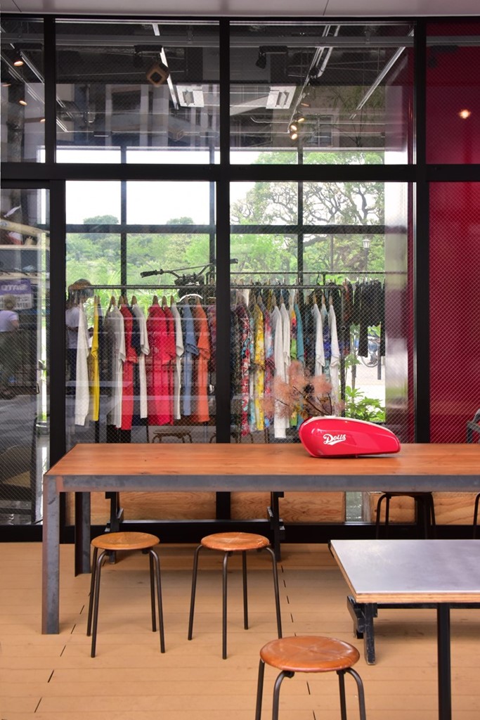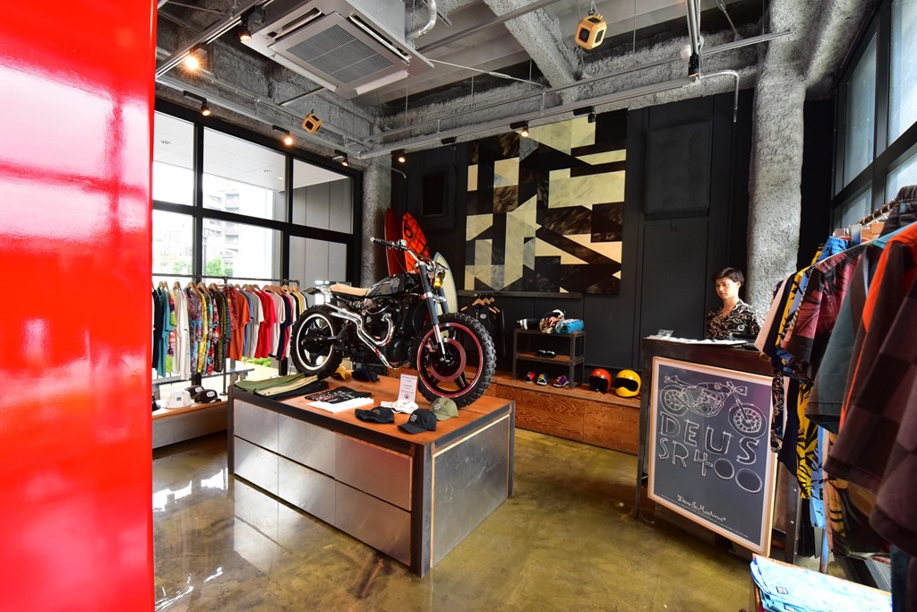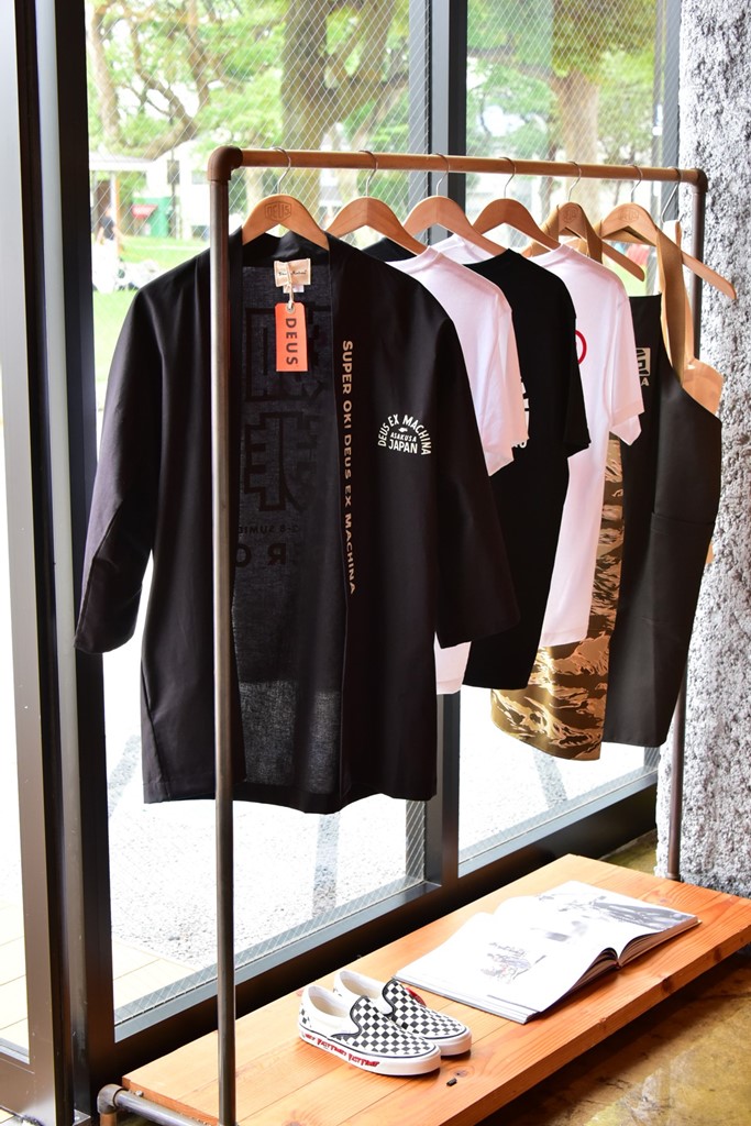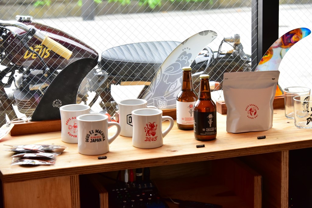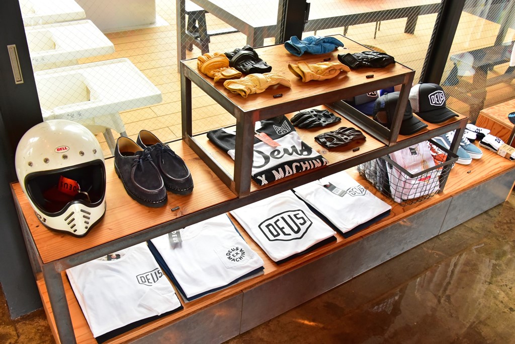 原宿時代同様に、店舗の半分はカスタムバイクやサーフィン、アパレルといったオリジナル商品などを販売する空間となっており、デウスの世界感を存分に味わえる。中央に置かれたバイクをはじめ店内に置かれた車両は販売もしているので気になる人は、ぜひ問い合わせてみて!