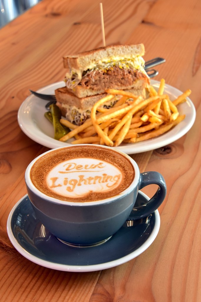 前店舗の看板メニューだった「BBQ PULLED PORK(1300円)」も健在! ラテアートが描かれた「DEUS LATTE(600円)」と一緒にオーダーしたいところ。今回は特別にLightningの文字を描いていただいた!