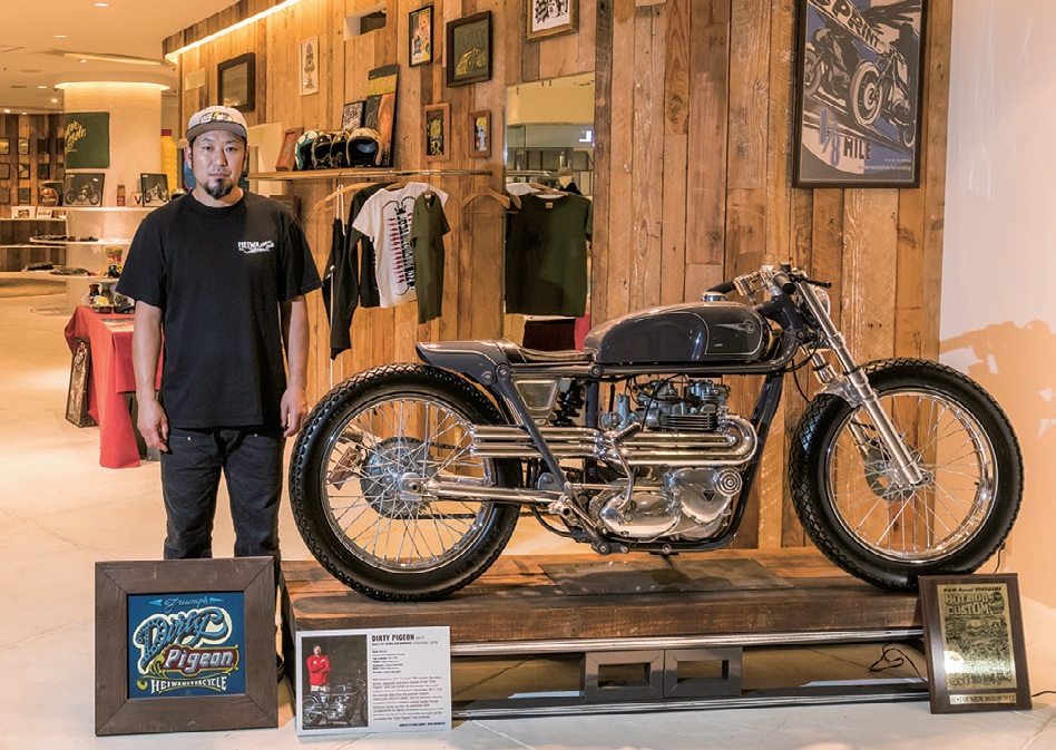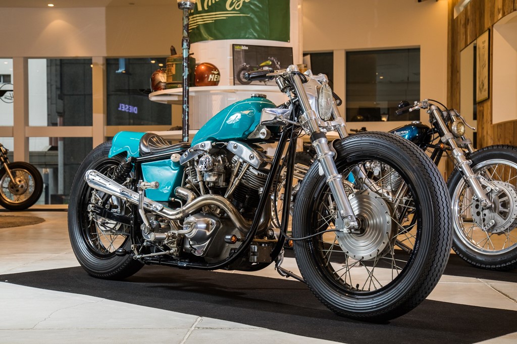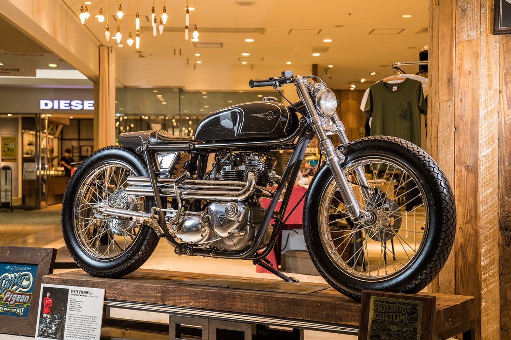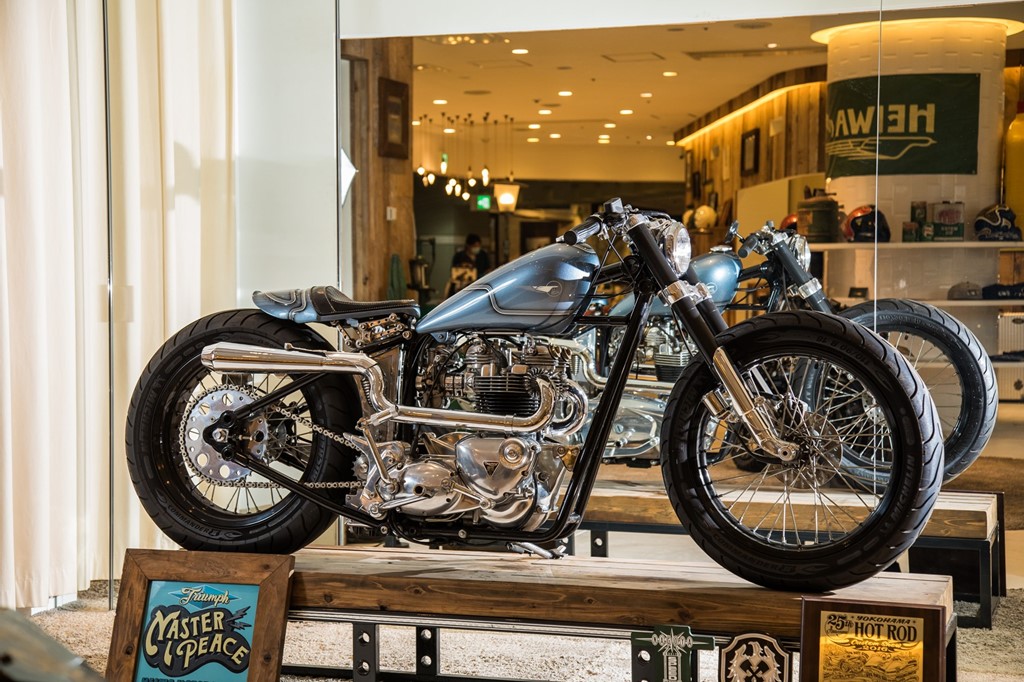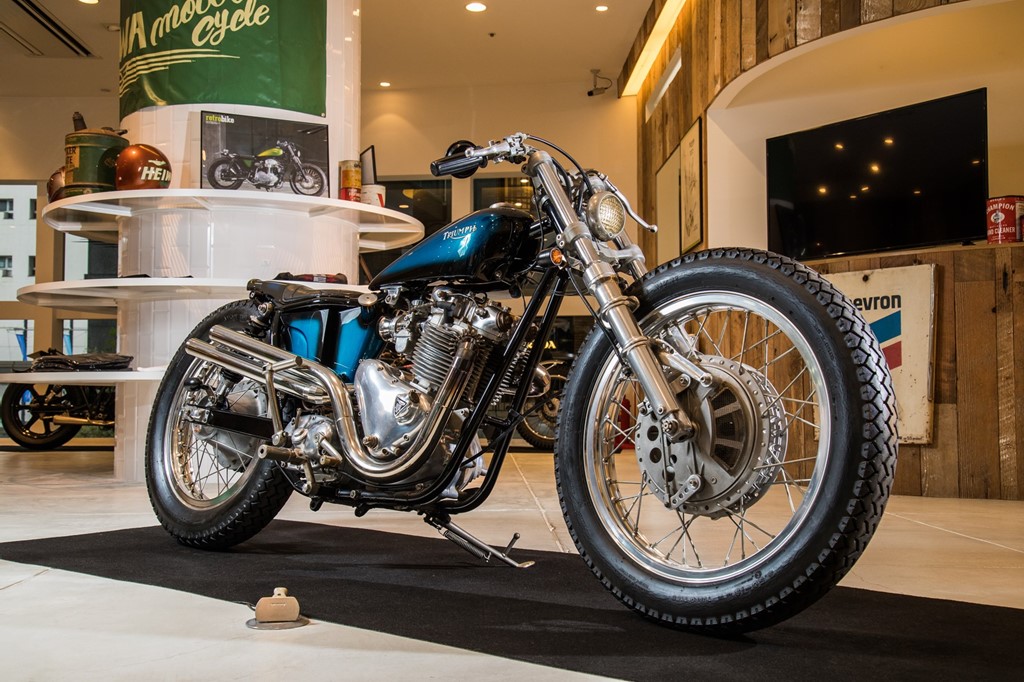 水平な直線を基調としたトライアンフ。前後同径のホイールやナローなスタイルなど美しい造形が際立つ。前年に続き2017年のホットロッドカスタムショーで優勝し、二連覇を果たした車両として知られる。