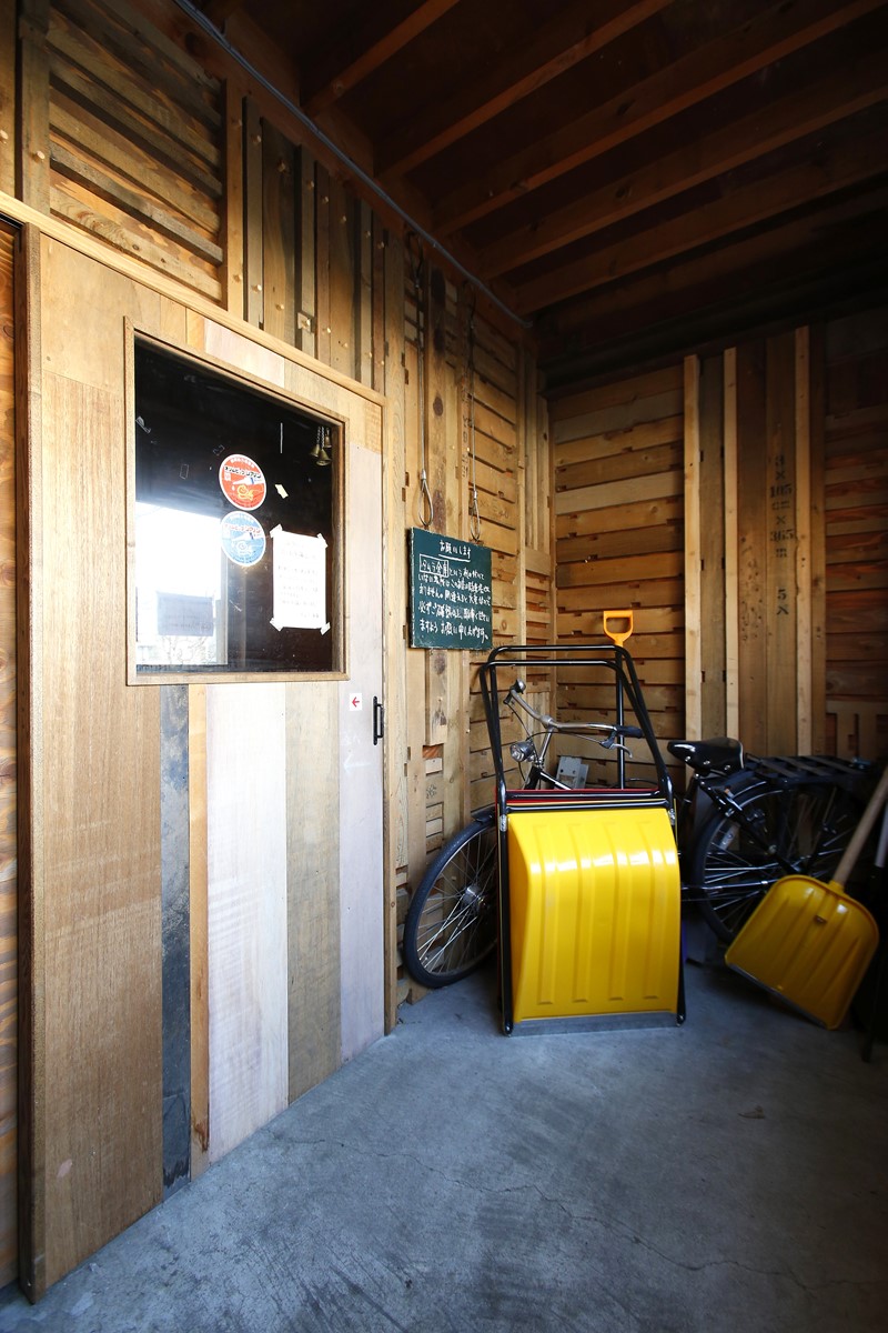 そう教えてくれたのは、「タムラ倉庫」店主の滝本忍さん。大工の手を借りながら自らも改修に関わった。入ってすぐの場所にあった階段は、入口付近のスペースを確保するために奥へ移築。また冬の寒さをしのぐため、壁とベニヤ板の間に断熱材を入れた。